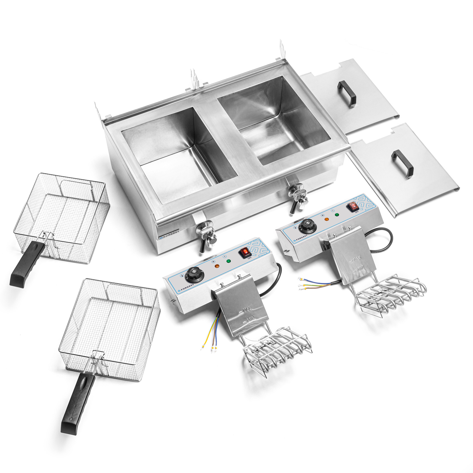 Friteuza electrică dublă 2x16l cu robinet FORGAST FG09016 este un echipament gastronomic profesional, dotat cu două cuve independente de mare capacitate și un sistem comod de golire a uleiului. Aparatul a fost proiectat pentru utilizare intensivă în restaurante, baruri de tip fast-food și unități de catering, unde eficiența și siguranța la locul de muncă sunt esențiale.
