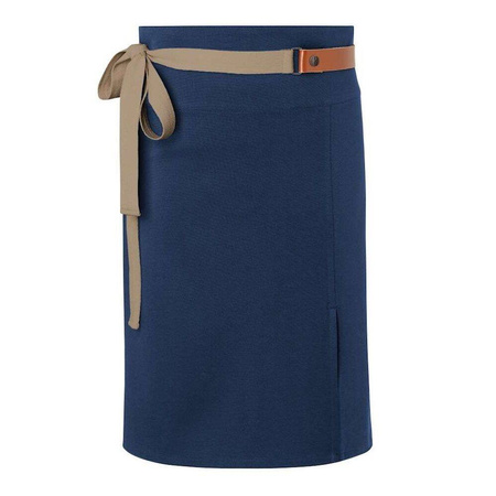 Fabricat dintr-un amestec de 35% bumbac și 65% poliester 100% plastic reciclat. Țesătură twill modernă. Durabil și ușor de curățat, culoare albastră elegantă. 2 buzunare de patch-uri de 18x20 cm. Curea din piele naturală în culori contrastante. Atașat cu ajutorul închizătoarelor cu clichet. Fantă de mers pentru a permite libertatea de mișcare.