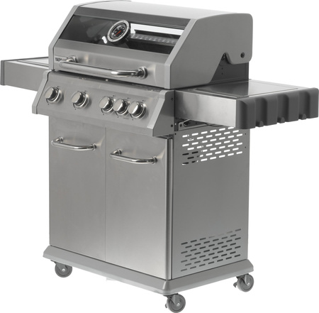 Setul 4+1 include 4 arzătoare principale din oțel inoxidabil de 3 kW fiecare și 1 arzător lateral de 2,2 kW pentru gătitul și încălzirea alimentelor într-o oală sau tigaie. Puterea totală este de 14,2 kW, cu o ardere medie a gazului de 1032 g/h. Diametrul duzei 4x0,8 + 1x0,7 mm. Caracterul practic al grătarului este evidențiat de rafturile laterale, dulapul spațios, capacul arzătorului (aromatizator), bolul din oțel rezistent la căldură și roțile pivotante cu frână pentru transport ușor. Caracteristicile suplimentare includ 6 umerașe pe rafturile laterale, 5 cadrane cu o lumină LED albastră care indică faptul că arzătoarele sunt pornite, un deschizător de sticle pe partea laterală a grătarului și posibilitatea de a scoate placa de scurgere și de a o spăla în afara grătarului.