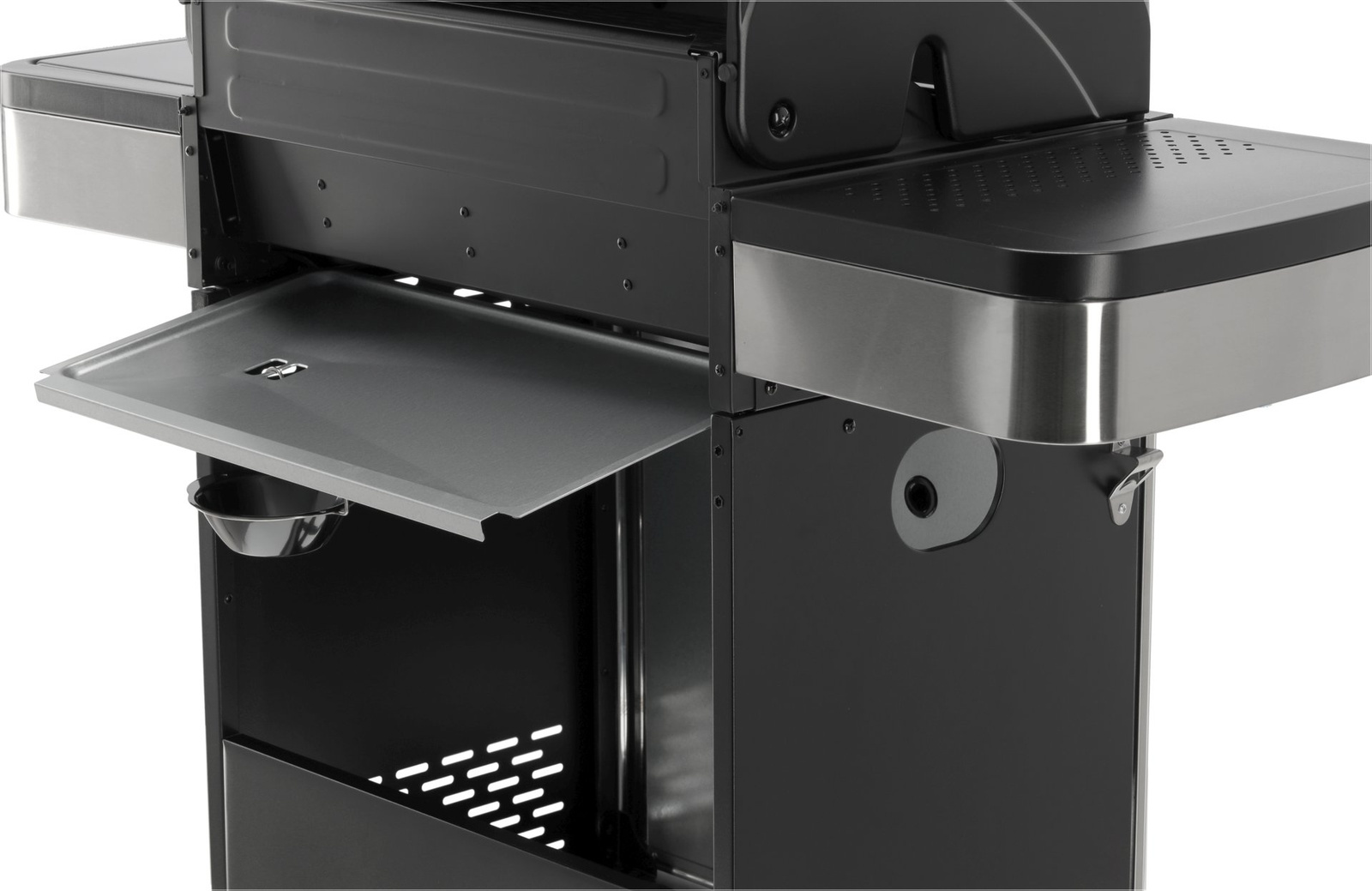 Unitatea oferă rafturi laterale practice și un dulap spațios, blocabil, pentru depozitarea ușoară a condimentelor și accesoriilor. Arzător lateral suplimentar de 2,2 kW pentru gătitul și încălzirea alimentelor pe un arzător separat.