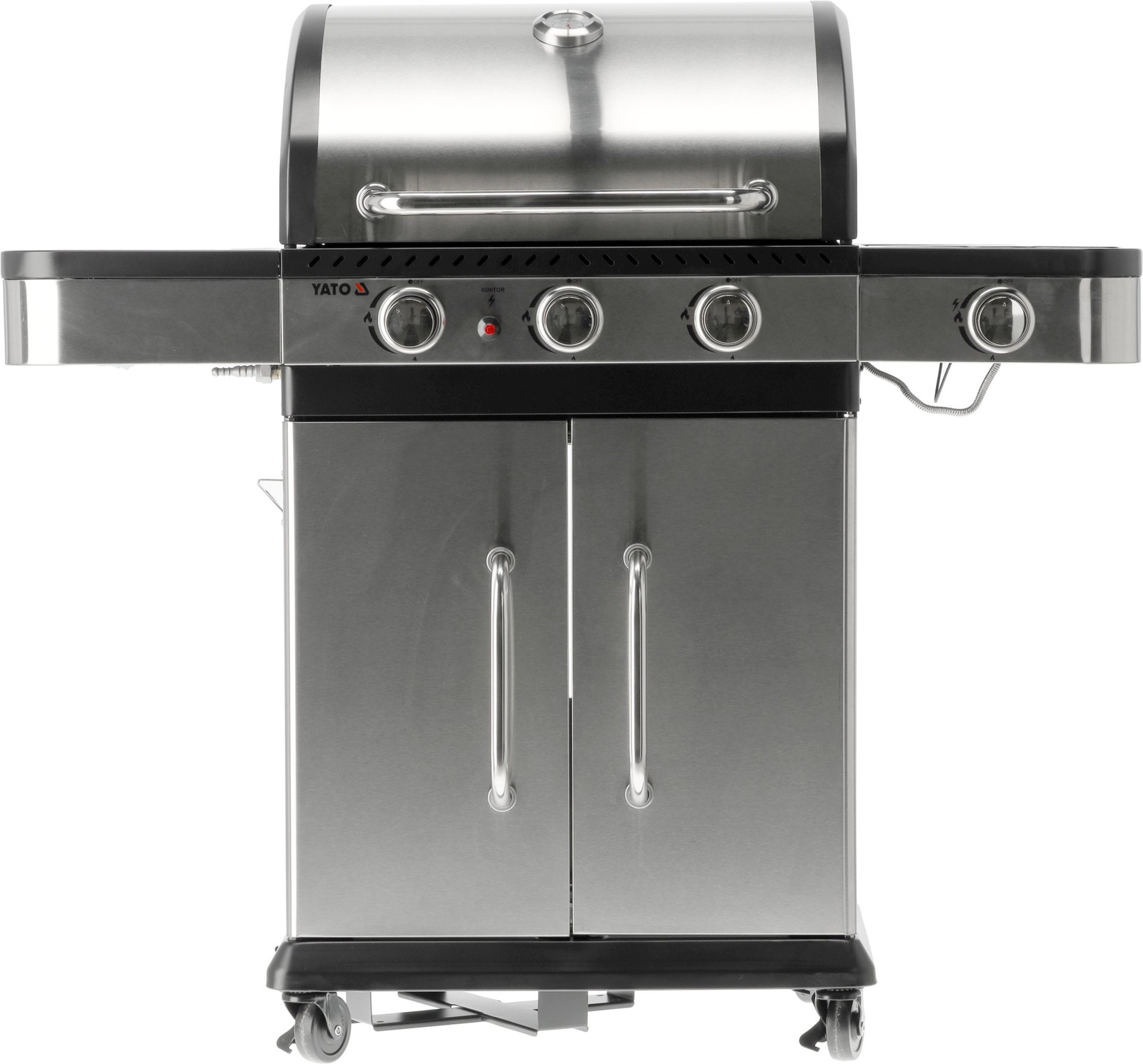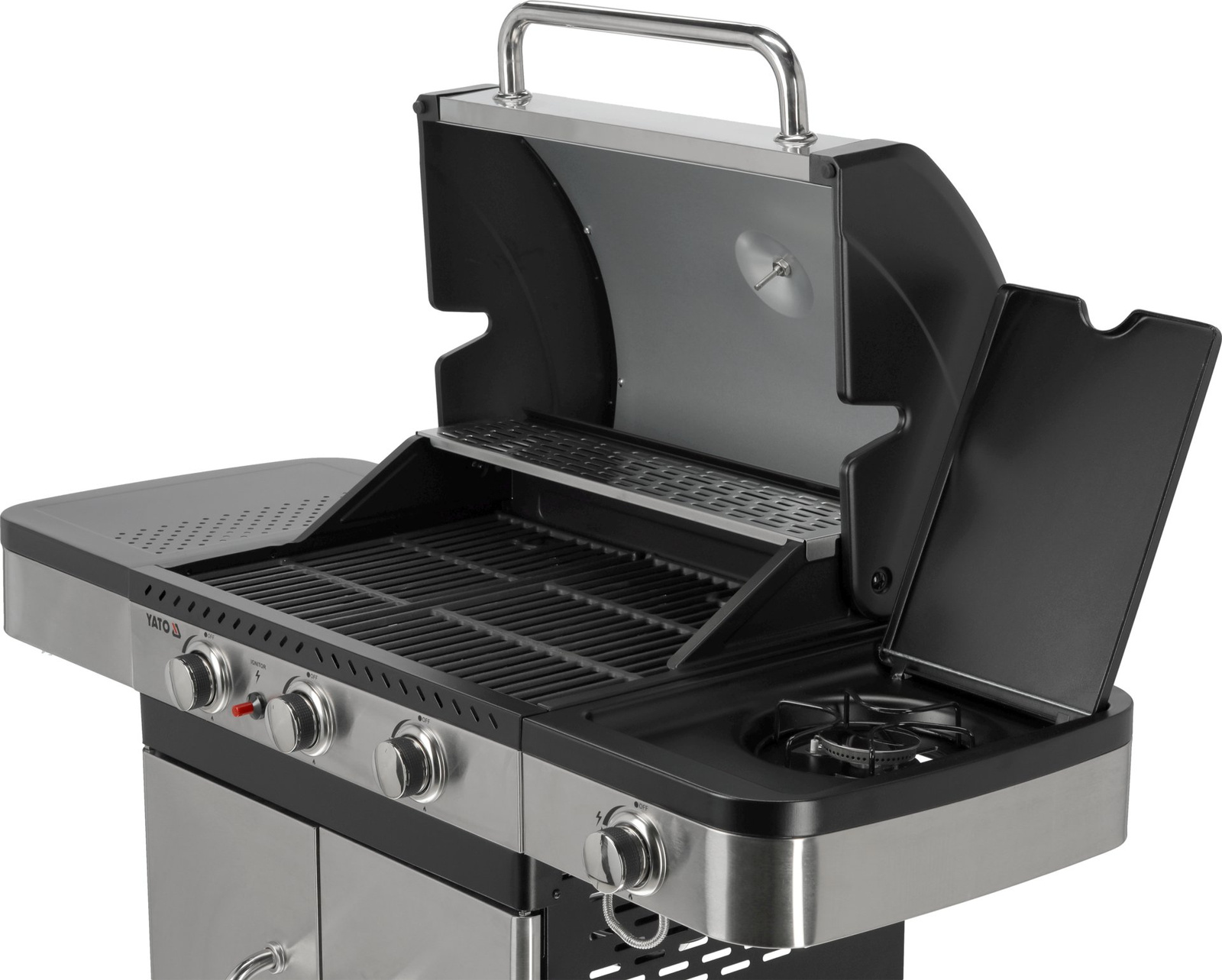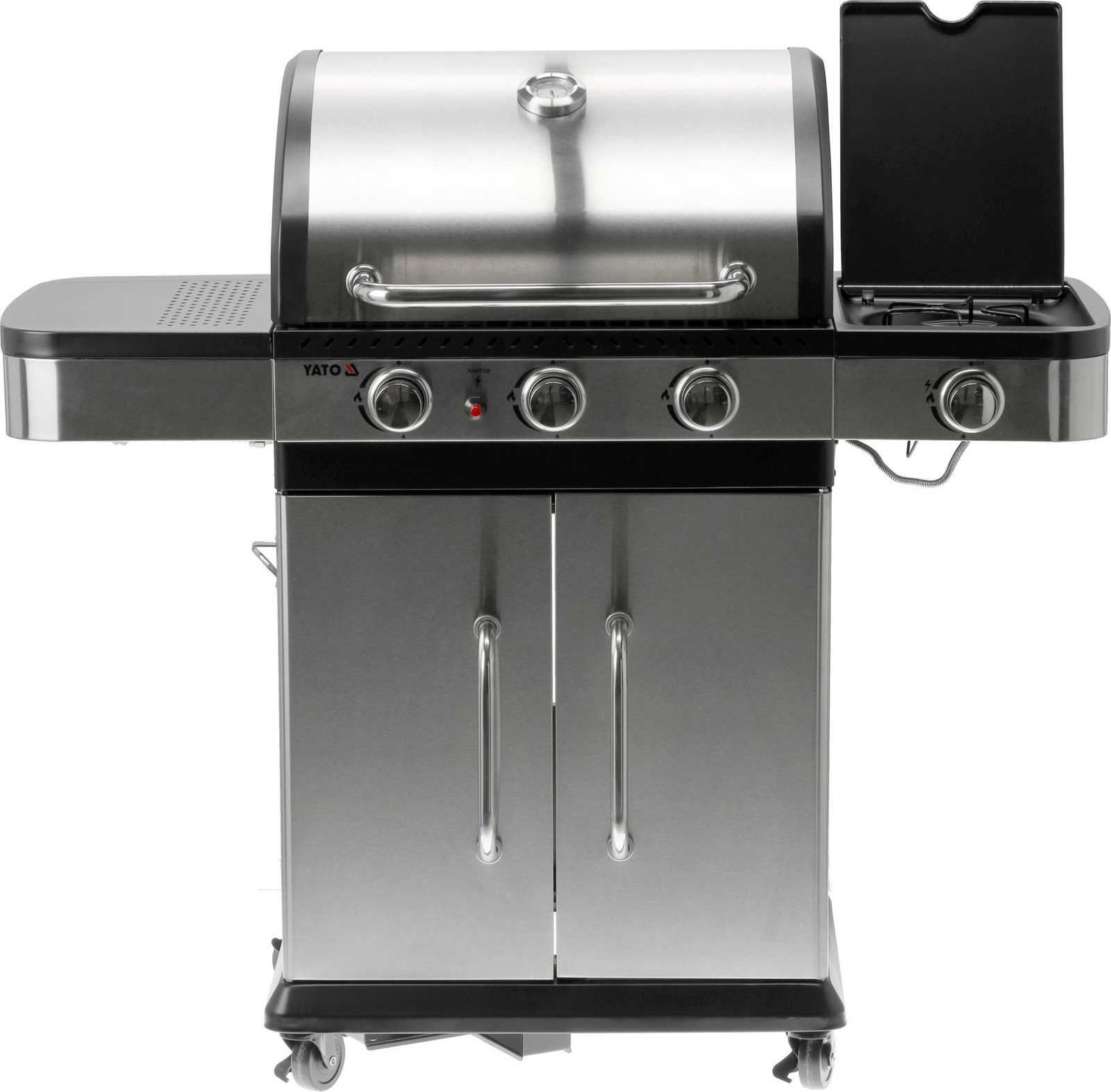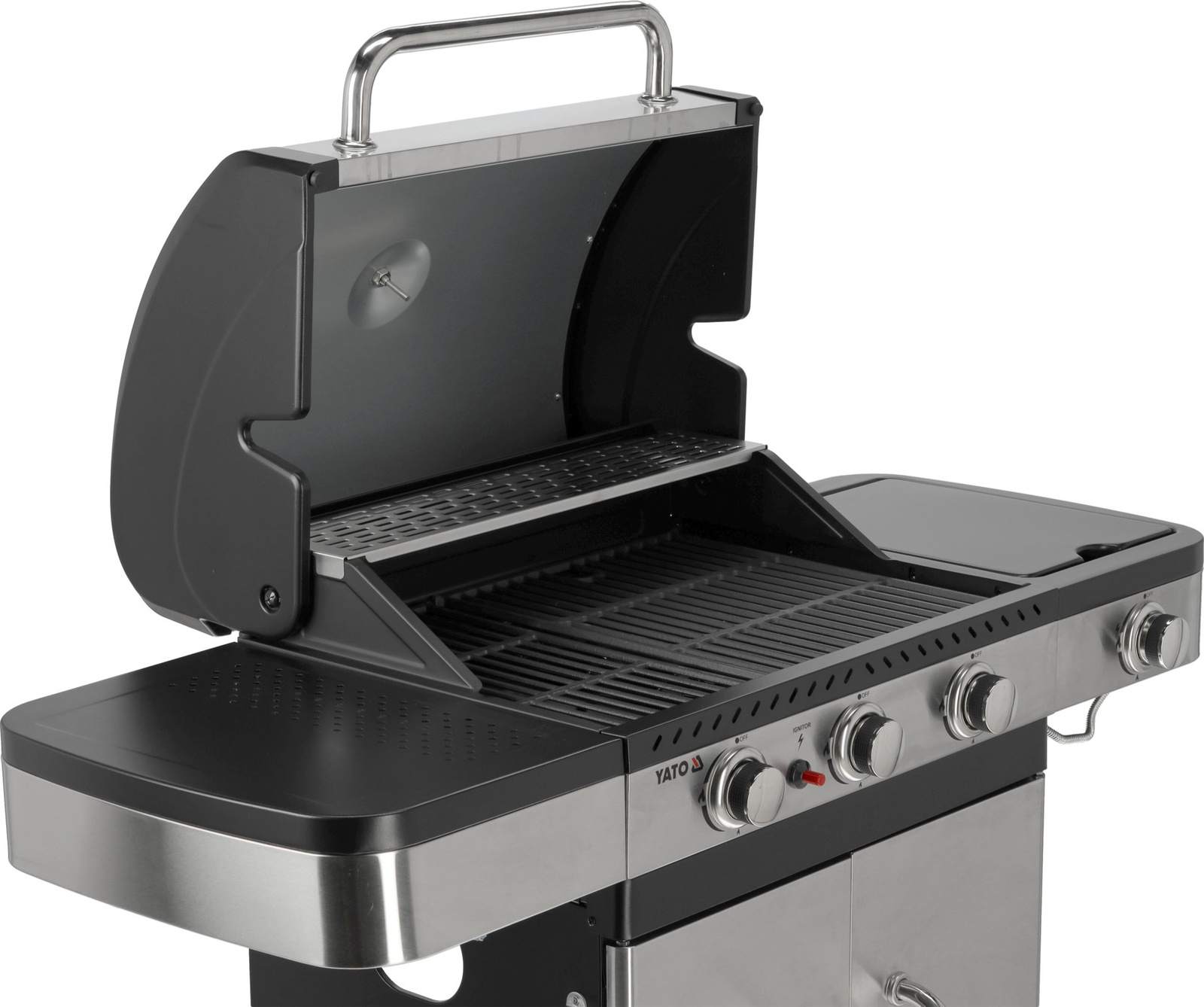 Grătar cu gaz 3+1 de la Yato, proiectat într-un stil modern, fabricat din oțel inoxidabil durabil și echipat cu un grătar eficient din fontă.