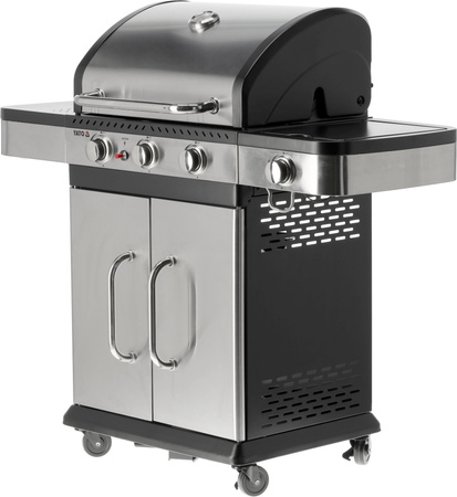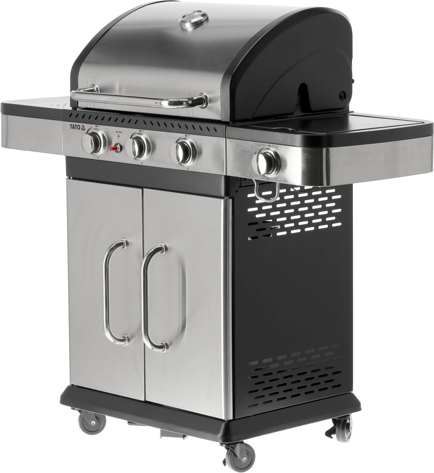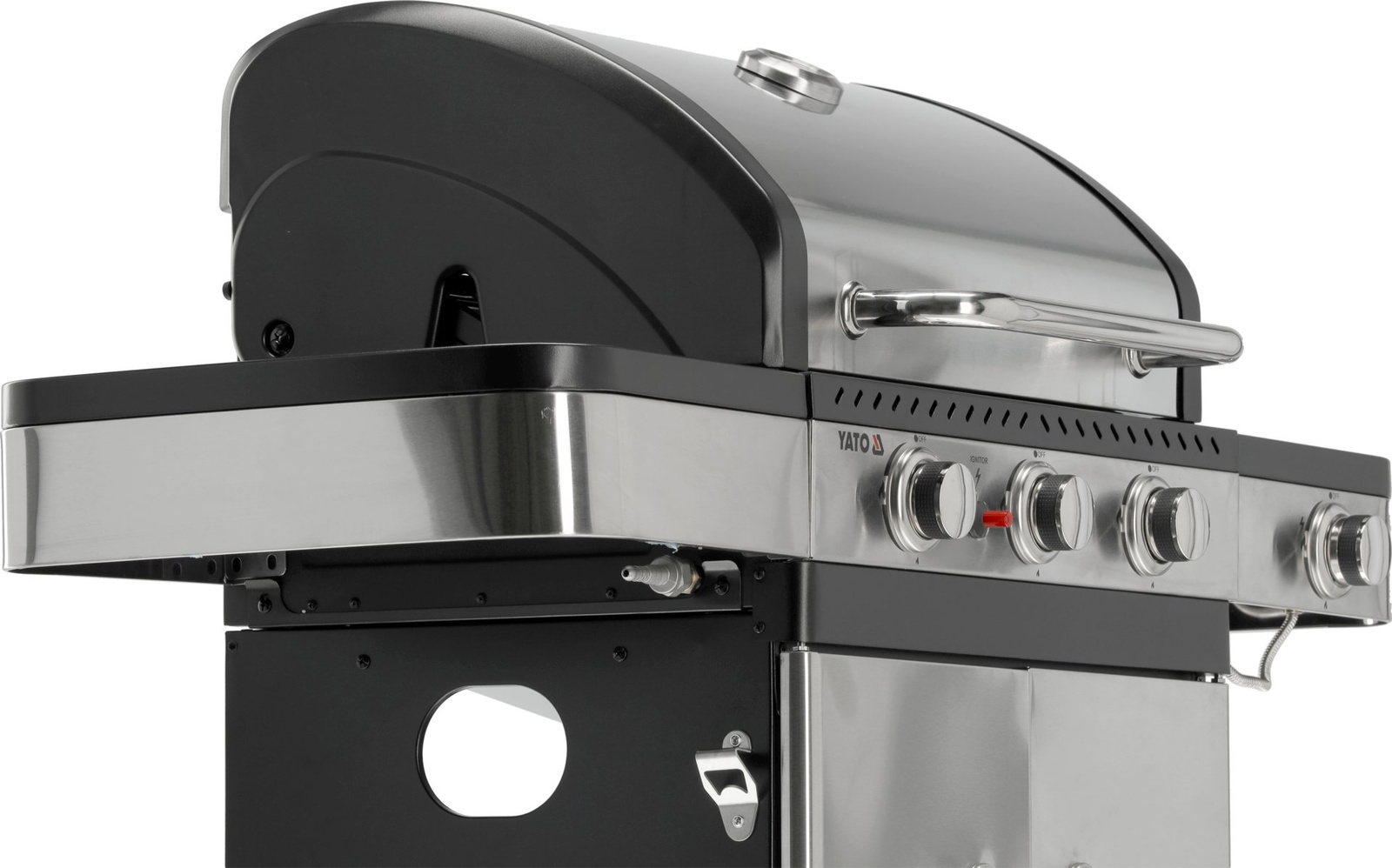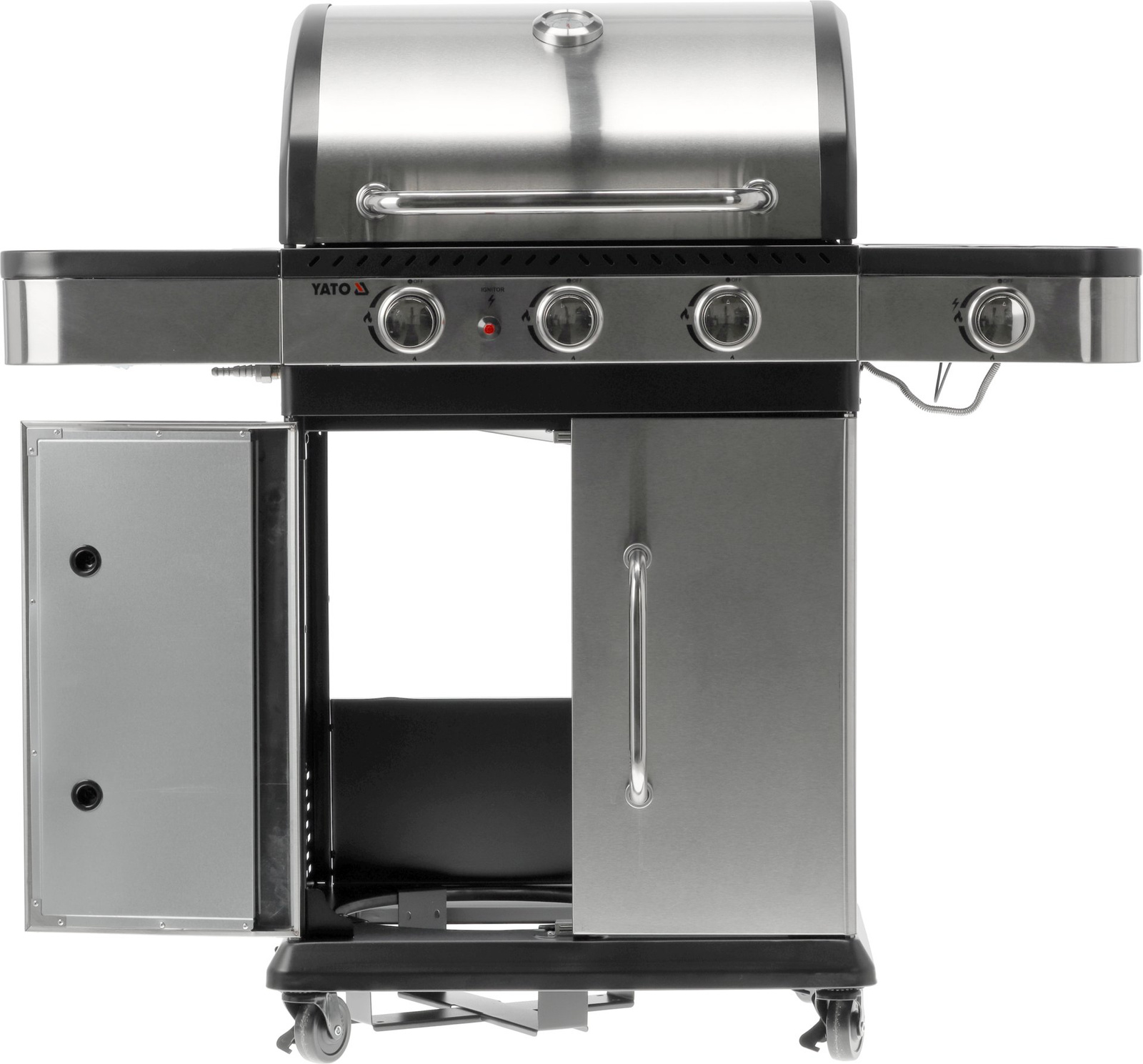 Grătar cu gaz 3+1 de la Yato, proiectat într-un stil modern, fabricat din oțel inoxidabil durabil și echipat cu un grătar eficient din fontă.