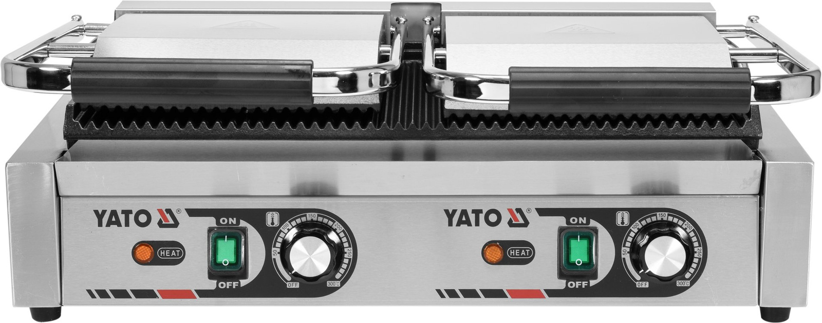 Grilă cu contact dublu de la YATO măsurând 58x36x19 cm. Este proiectat pentru prepararea rapidă a burgeri, carne, pește, tortilla, pâine prăjită sau legume. Fabricat din oțel inoxidabil de înaltă calitate. O tavă de scurgere a grăsimilor pe partea din față a plitei și o deschidere specială facilitează curățarea. Placă de grătar din fontă cu placă superioară dimensiuni 48x23 cm este instrumentul perfect pentru prăjirea simultană a mai multor produse pe ambele părți. Există două panouri independente în partea de sus. Datorită structurii ondulate atât pe partea superioară, cât și pe cea inferioară, această plită garantează prepararea uniformă și eficientă a alimentelor. Încălzitor cu putere 3,6 kW este controlat de 2 potențiometre independente situate pe panoul frontal. Este posibil să se regleze temperatura de la 50~300ºC.