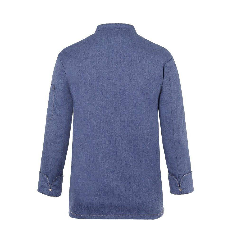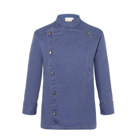 Bluză bucătar bărbați Jeans-Style marca Karlowsky. Culoare vintage-blue. Fabricată din 65% poliester și 35% bumbac. Țesătură diagonală. Bluză modernă pentru bucătar în stil jeans, cu cusături contrastante, manșete cu deschidere și buzunar pe mâneca stângă. Bluză asimetrică cu închidere pe un rând, cu 5 nasturi și capse. Potrivită pentru spălare industrială și curățare chimică. Nu se albeste. Disponibilă în mărimi de la 46 la 74.