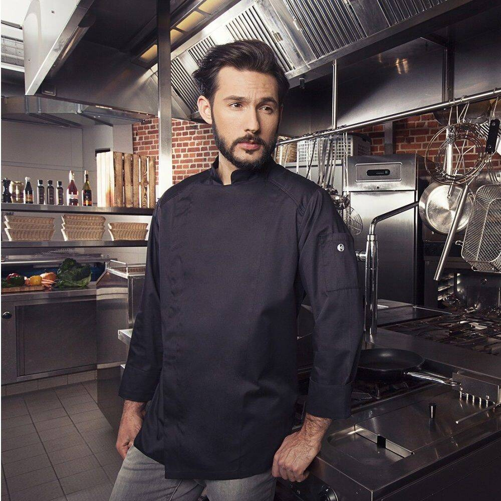 Hanorac de bucătar Noah pentru bărbați de la Karlowsky. Culoare negru. Fabricat în 50% poliester și 50% bumbac. Țesătură diagonală. Hanorac elegant de bucătar pentru bărbați cu panou ascuns cu fermoar. Fabricat din material foarte ușor, ideal pentru condiții de căldură. Confort optim la purtare datorită croielii ajustate. Partea din spate a gulerului are o curea practică pentru șorț pentru a preveni alunecarea șorțului. Manșete cu crăpătură. Buzunar cusut pe mâneca stângă cu compartiment pentru stilou. Potrivit pentru spălare industrială și curățare uscată. Poate fi albit. Mărimi disponibile de la 46 la 64.