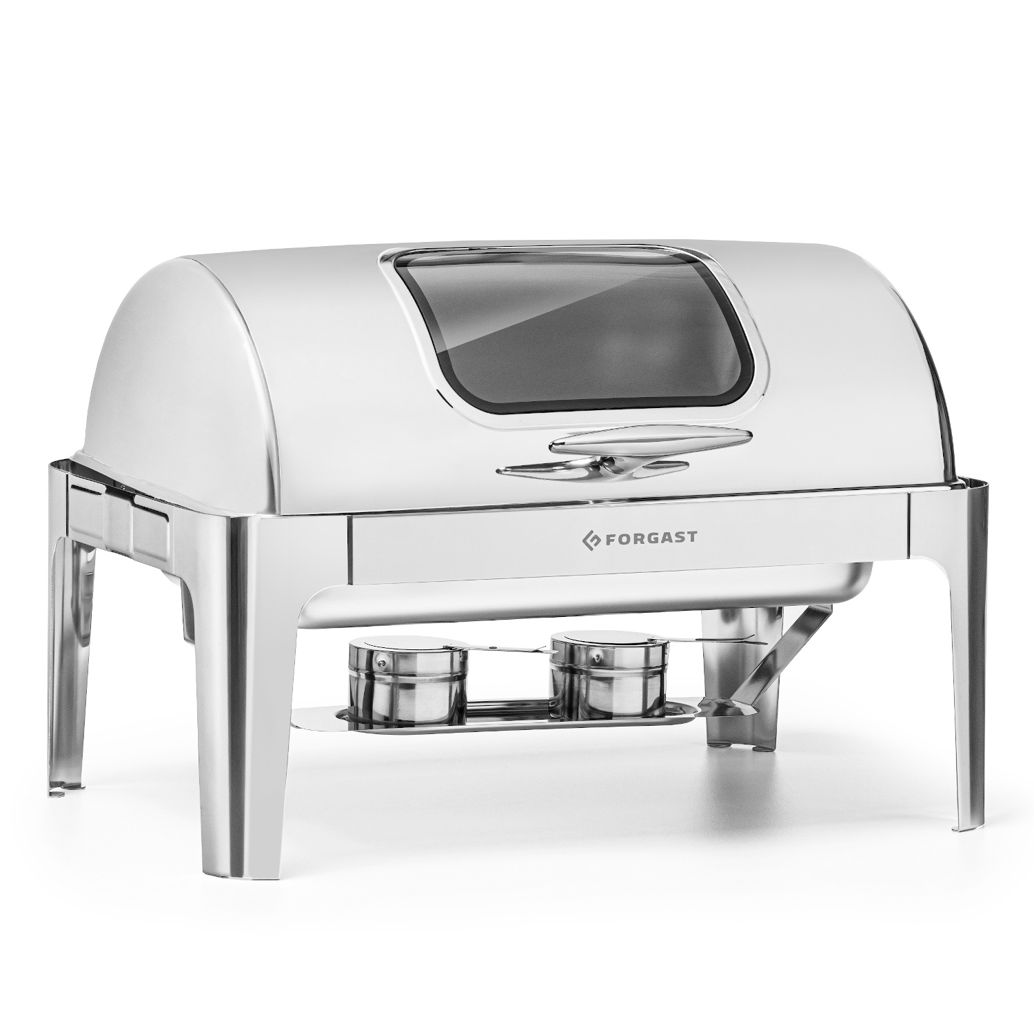 Aparatul este echipat cu capac roll-top cu vizor transparent, care permite dozarea ușoară a preparatelor și controlul stării acestora fără a deschide capacul. Setul include o tavă GN 1/1 cu adâncimea de 6,5 cm și două recipiente pentru combustibil, care asigură încălzirea uniformă a întregului conținut. Toate componentele sunt ușor de asamblat și demontat, facilitând transportul și curățarea după utilizare.