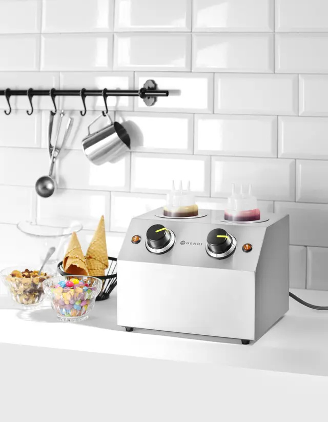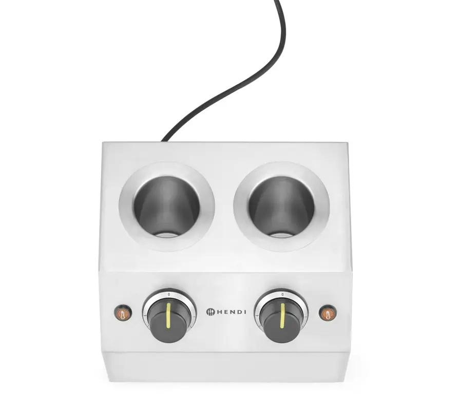 Încălzitor dublu pentru sosuri marca HENDI este un instrument profesional, ideal pentru orice bucătărie, în special la servirea deserturilor. Proiectat pentru a menține sosurile calde, permite dozarea precisă și păstrarea unei consistențe uniforme. Datorită reglării temperaturii între 30 și 65°C, permite ajustarea densității sosului în funcție de nevoile individuale. Carcasa încălzitorului este realizată din oțel inoxidabil durabil, ceea ce garantează o utilizare îndelungată. Dispozitivul este echipat cu un buton rotativ cu 6 trepte pentru reglarea temperaturii și un indicator luminos care semnalează procesul de încălzire. Setul include două sticle din LDPE cu o capacitate de 650 ml, care se potrivesc perfect cu elementele de încălzire.