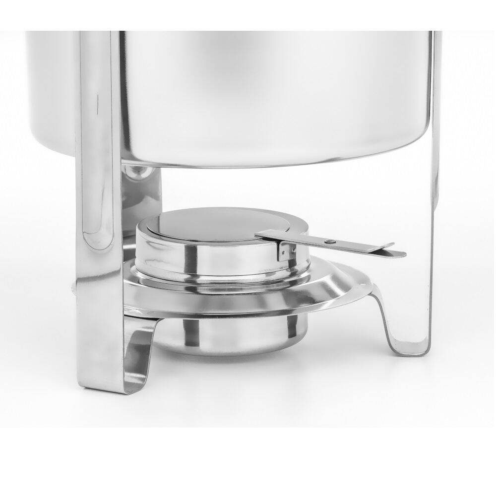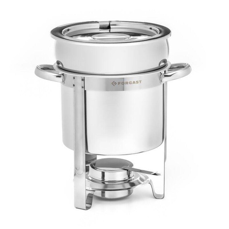 Încălzitorul rotund pentru supă de 11 l pe combustibil FORGAST FG03111 este un dispozitiv gastronomic profesional care permite servirea confortabilă și eficientă a preparatelor calde la diverse evenimente și în locații gastronomice. Se remarcă prin capacitatea mare și construcția durabilă din oțel, fiind ideal pentru utilizare intensă în timpul nunților, banchetelor sau petrecerilor în aer liber.