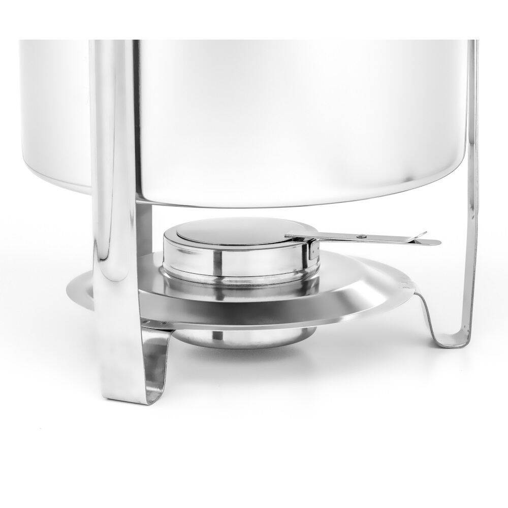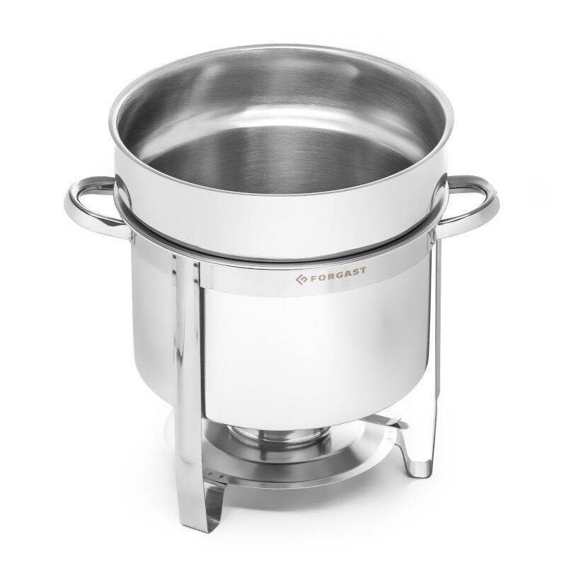 Încălzitorul rotund pentru supă de 7 l pe combustibil FORGAST FG03107 este un dispozitiv gastronomic profesional, care se remarcă prin capacitatea mare și execuția din oțel inoxidabil. Este destinat servirii supelor și preparatelor fierbinți la diverse evenimente, precum banchete, conferințe, nunți sau petreceri în aer liber. Cel mai mare avantaj al său este lipsa necesității conectării la curent electric, precum și aspectul elegant, argintiu, care subliniază estetica oricărui bufet.