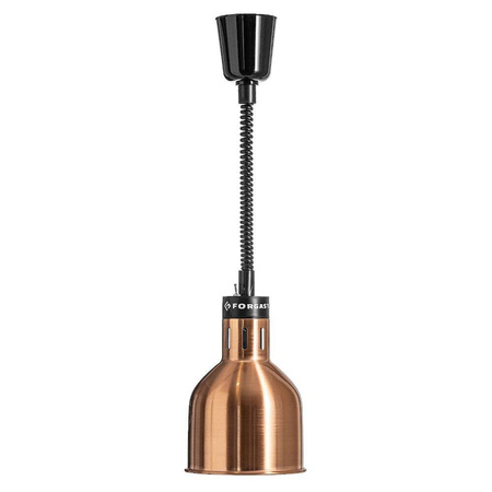 Lampa de încălzire pentru mâncăruri cupru - tip A FORGAST FG03340 este un dispozitiv profesional creat pentru a menține temperatura optimă a preparatelor în locațiile de gastronomie. Se remarcă prin finisajul elegant din cupru și posibilitatea de reglare a înălțimii, ceea ce o face ideală pentru restaurante, săli de evenimente sau servicii de catering. Lampa este echipată cu un bec care emite o lumină plăcută, caldă, accentuând atractivitatea preparatelor servite.