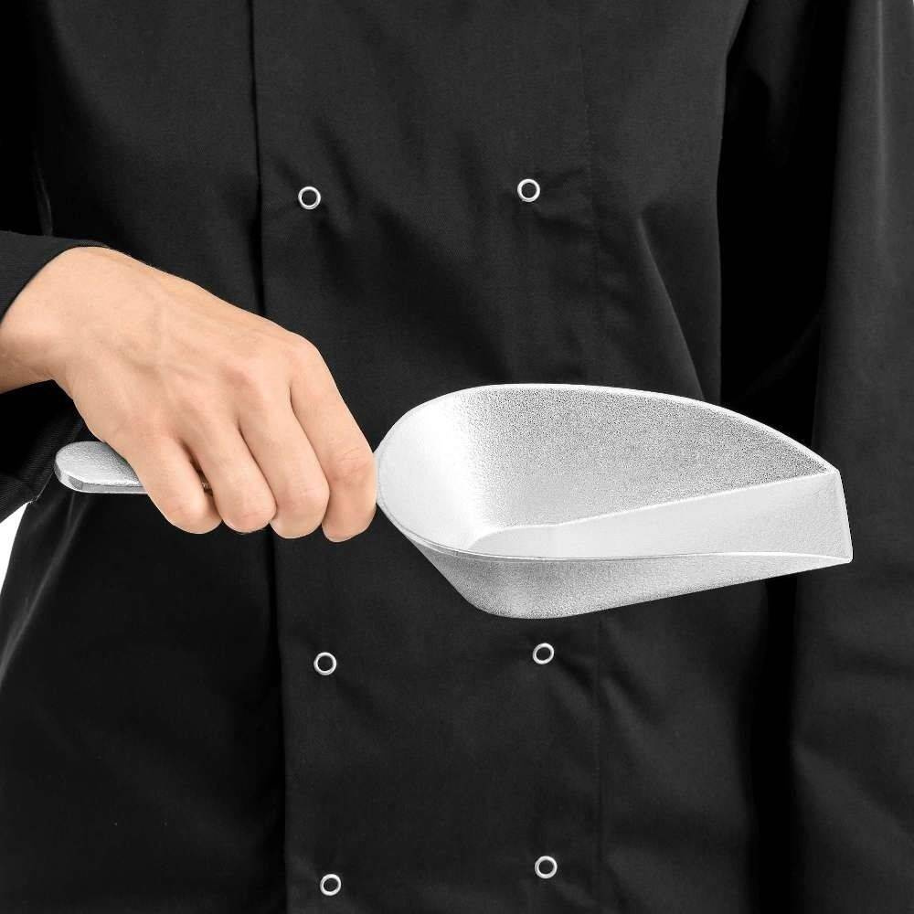 Lingura din aluminiu FORGAST cu o capacitate de 0,47 l a fost proiectată pentru utilizare intensivă. Suprafața sa plată facilitează luarea atât a produselor vrac mici, cât și a celor mai mari. Astfel, este perfectă pentru brutării, restaurante, magazine alimentare sau depozite, unde rapiditatea și precizia sunt esențiale. Construcția din aluminiu este rezistentă la deteriorări și ușor de întreținut, ceea ce asigură igiena în muncă. Setul conține o singură lingură, gata de utilizare imediată.