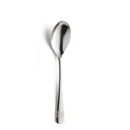 Lingură pentru copii din linia Teddy Bear de la Amefa, 16,8 cm lungime. Fabricat din oțel inoxidabil 18/10. Gama de tacâmuri Teddy Bear este realizată cu atenție la detalii și este dimensionată pentru a se potrivi mâinilor mici, ceea ce o face perfectă pentru grădinițe. Fiecare piesă are o gravură cu un design de ursuleț de pluș. Tacâmuri cu margini netezite.