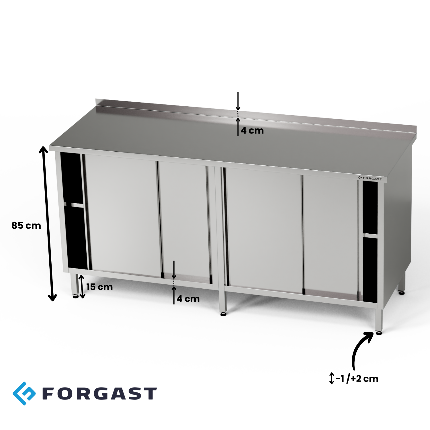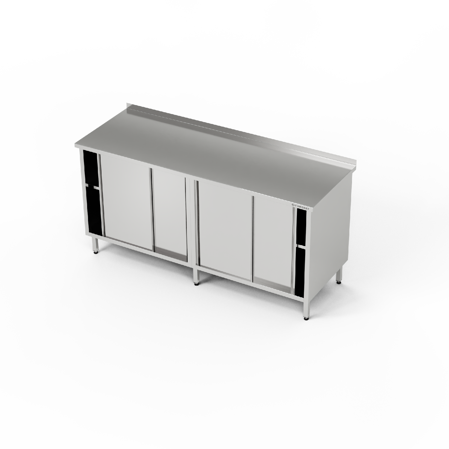 Masă de lucru cu dimensiuni 230x60x85 cm cu 2 dulapuri cu uși glisante din oțel inoxidabil J4. Raft în interiorul dulapurilor.