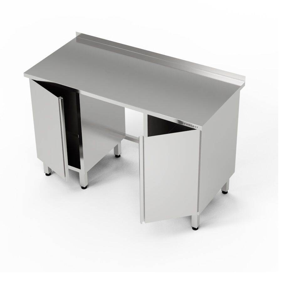 Bancul de lucru cu două dulapuri cu dimensiuni 260x70x85 cm din oțel inoxidabil J4. Dulapurile sunt situate la dreapta și la stânga. Există rafturi în dulapuri.