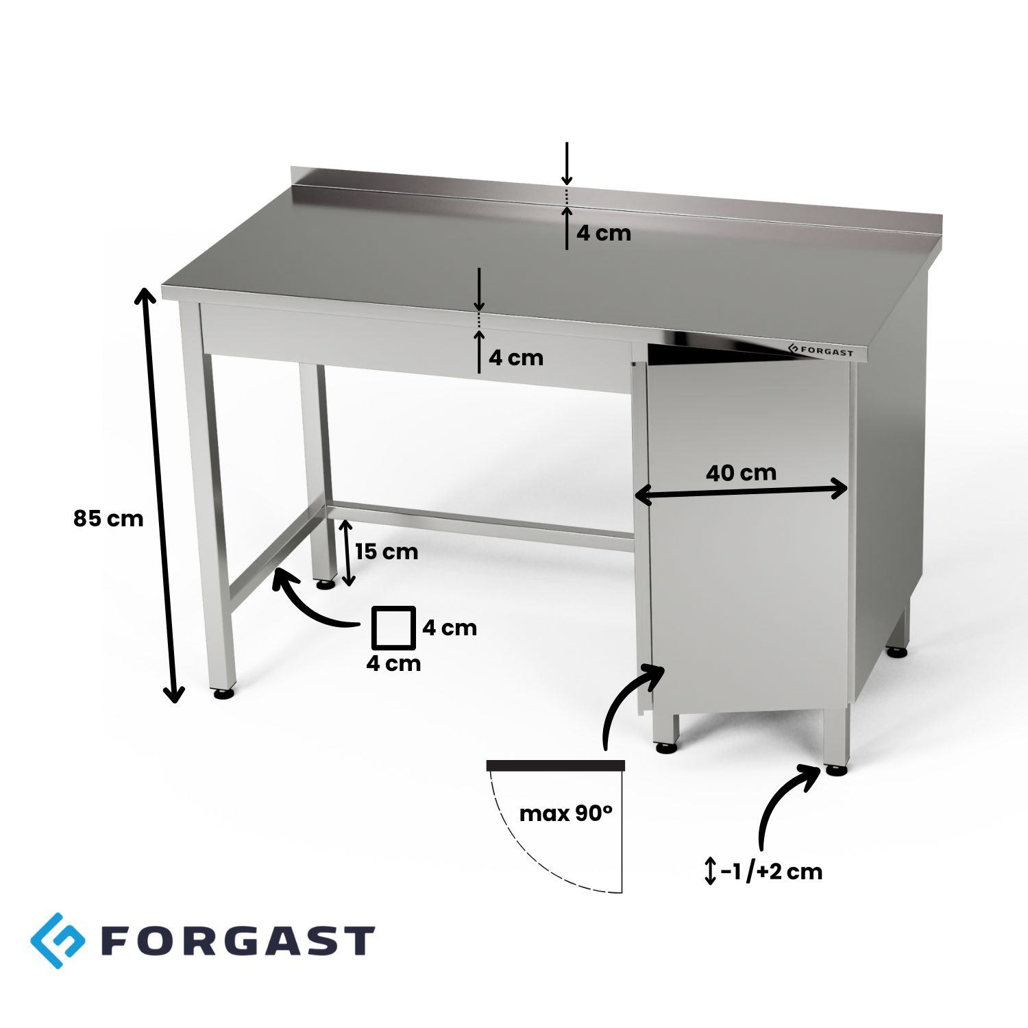 Masă de lucru cu dulap cu uși cu deschidere, 200x60x85 cm, din oțel inoxidabil J4. Dulapul, care are 40 cm lungime și 60 cm lățime (adâncime), poate fi poziționat pe partea dreaptă sau pe partea stângă. Raft în interiorul dulapului.