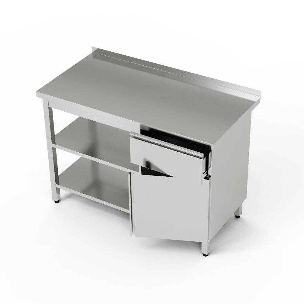 Descriere Masă de lucru de dimensiuni 100x70x85 cm cu un dulap cu uși care se deschid, un sertar și 2 rafturi. Dulap cu sertar, lung de 40 cm și lat de 60 cm (adâncime), situat pe partea dreaptă. Raft în interiorul dulapului. Două rafturi în stânga. J4 masă din oțel inoxidabil. O masă de lucru este un echipament esențial pentru o afacere profesională de catering. Fabricat din oțel inoxidabil cu grosimea de 0,8-1 mm. Suprafața mesei este izolată fonic cu plăci aglomerate lipite de partea inferioară a plăcii cu adezivi care îndeplinesc toate cerințele pentru contactul cu produsele alimentare. Protecția plăcii cu agenți de impermeabilizare face masa rezistentă la umiditate. Cadrul mesei se bazează pe secțiuni cu profil închis.