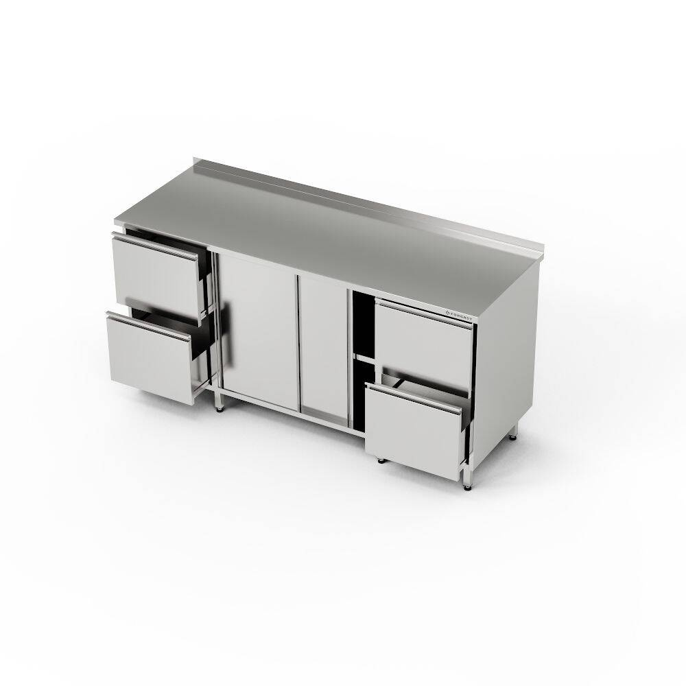 Masă de lucru 250x60x85 cm cu 2 blocuri de 2 sertare și un dulap cu uși glisante. Raft în interiorul dulapului. Fabricat din oțel inoxidabil J4. Dulap în mijloc, între blocul de sertare. Dimensiunile sertarelor într-un bloc cu 2 sertare: 44x46.5x44/18 cm.