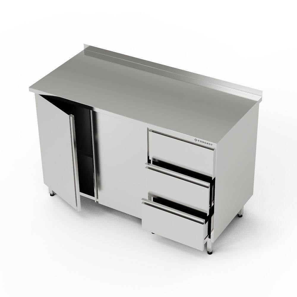 Masă de lucru 120x70x85 cm cu bloc cu 3 sertare și dulap cu uși cu deschidere. Raft în interiorul dulapului. Fabricat din oțel inoxidabil J4. Dulapul poate fi poziționat pe partea dreaptă sau stângă. Dimensiunile sertarelor într-un bloc cu 3 sertare: 46.5x21.5x44/13 cm.