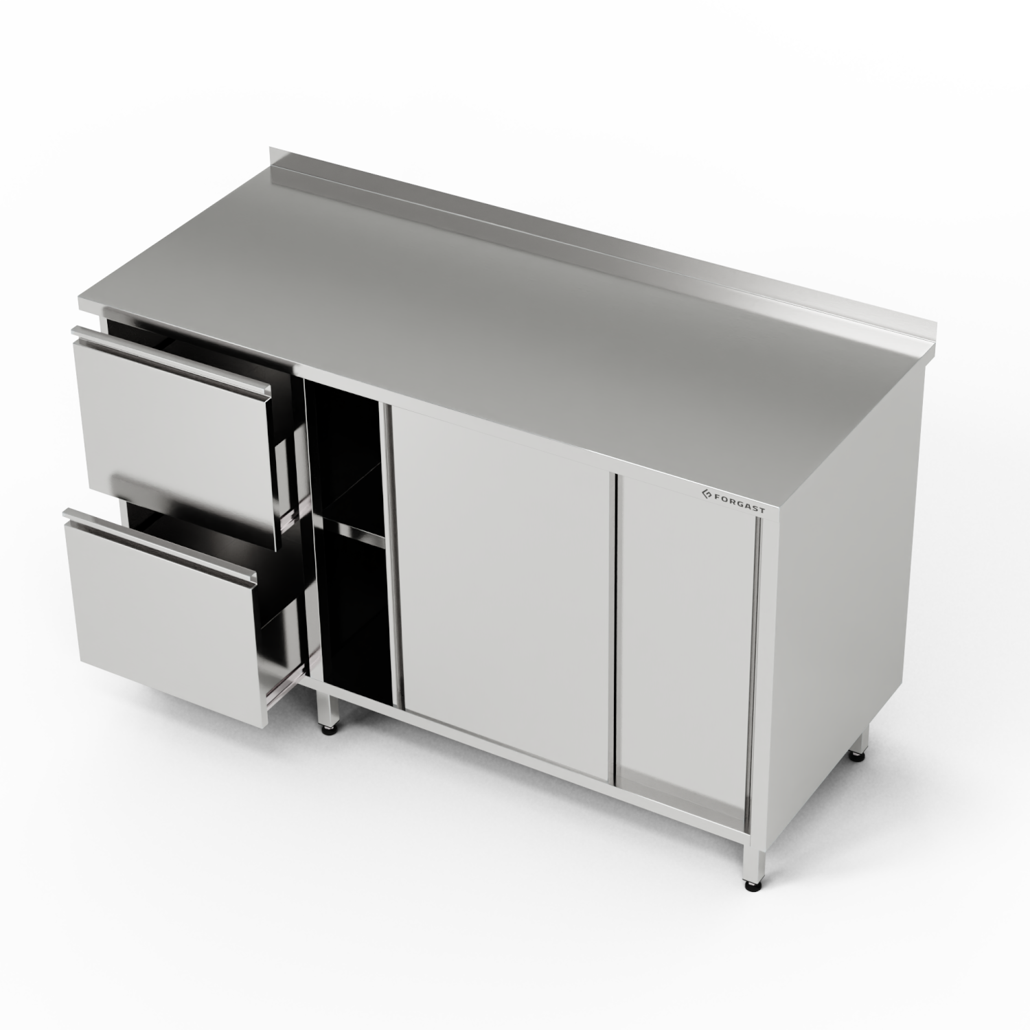 Masă de lucru 270x60x85 cm cu bloc cu 2 sertare și dulap cu uși glisante din oțel inoxidabil J4. Cabinet poziționat pe dreapta. Dimensiunile sertarului în blocul cu 2 sertare: 44x46.5x44/18 cm.