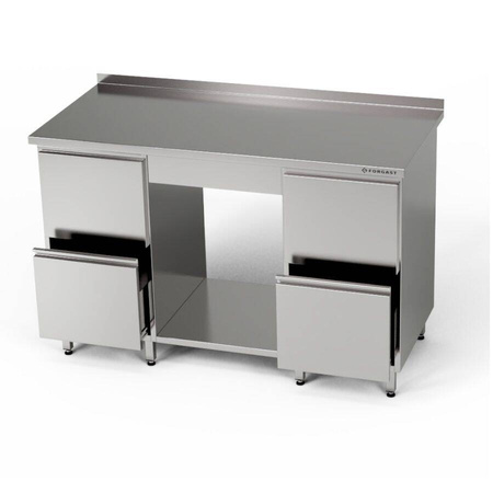Masă de lucru 180x70x85 cm cu 2 blocuri de 2 sertare și un raft. Fabricat din oțel inoxidabil J4. Raftul este situat între blocurile de sertare. Dimensiunile sertarelor într-un bloc cu 2 sertare: 44x46.5x44/18 cm.