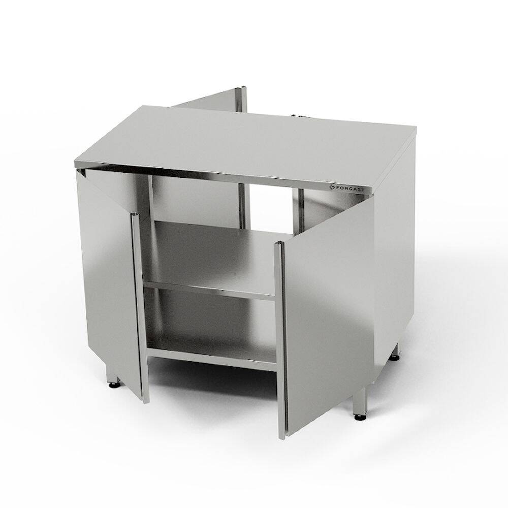 Bancul de lucru de trecere cu dimensiunile 140x60x85 cm din oțel inoxidabil J4. Masa are o ușă cu balamale și un dulap care include un raft. Masă centrală fără jante.