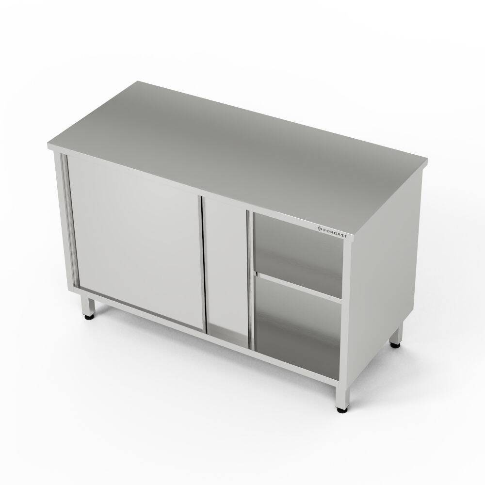 Bancul de lucru de trecere cu dimensiuni de 150x60x85 cm cu dulap cu ușă glisantă din oțel inoxidabil J4. Raft în interiorul dulapului. Dulapul are uși glisante pe ambele părți.