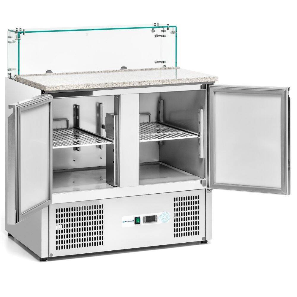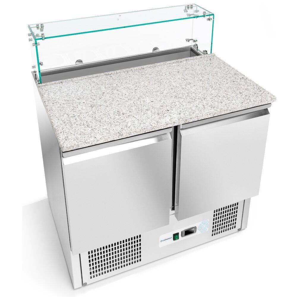 Masa frigorifică cu două uși pentru pizza marca Forgast este un echipament profesional destinat depozitării și pregătirii ingredientelor pentru pizza. Datorită suprastructurii din sticlă și blatului din granit, asigură confortul lucrului și estetică, iar capacitatea de 257 litri permite utilizarea eficientă a spațiului de lucru în pizzerii, restaurante sau alte unități gastronomice.