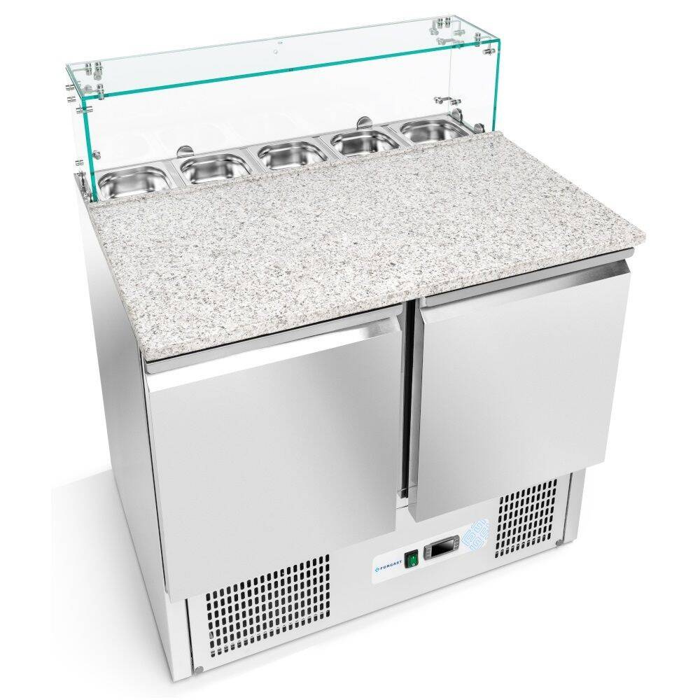 Acest model este ideal pentru pizzerii, restaurante, bufete și unități care servesc pizza proaspătă și alte preparate ce necesită acces rapid la diverse ingrediente. Suprastructura din sticlă permite prezentarea ingredientelor, iar capacitatea de 257 litri permite depozitarea unor rezerve mai mari. Controlerul electronic și reglajul precis al temperaturii garantează siguranța produselor alimentare chiar și în timpul lucrului intensiv în bucătărie. Echipamentul este livrat în două pachete – separat masa și suprastructura de sticlă pentru montaj individual, ceea ce facilitează transportul și instalarea în locație.