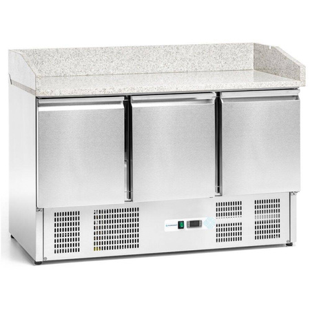 Masa frigorifică cu 3 uși pentru pizza 400 l FORGAST FG07303 este un echipament frigorific profesional destinat pregătirii și depozitării ingredientelor pentru pizza în condiții gastronomice. Se remarcă printr-un blat de lucru mare din granit și o construcție solidă din oțel inoxidabil. Este ideală pentru pizzerii, restaurante și unități gastronomice unde contează confortul muncii și standardul ridicat de igienă.