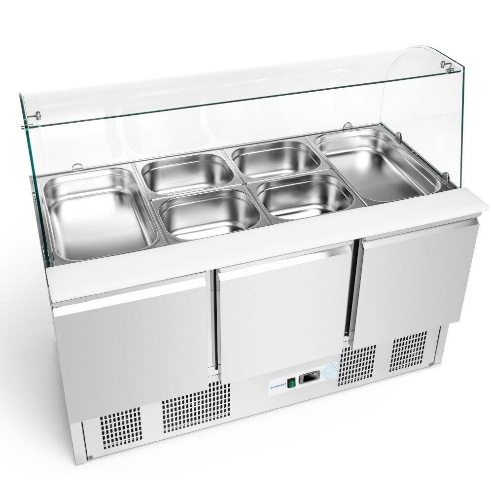 Masa frigorifică cu 3 uși pentru salate, 400 l, cu suprastructură de sticlă FORGAST FG07104 este un echipament profesional pentru gastronomie, ideal pentru restaurante, baruri de salate, hoteluri sau puncte de servire rapidă. Acest dispozitiv se remarcă prin capacitatea mare și suprastructura practică din sticlă pentru expunerea și servirea ingredientelor pentru salate. Datorită construcției compacte și soluțiilor tehnice moderne, permite pregătirea și depozitarea comodă a produselor proaspete.