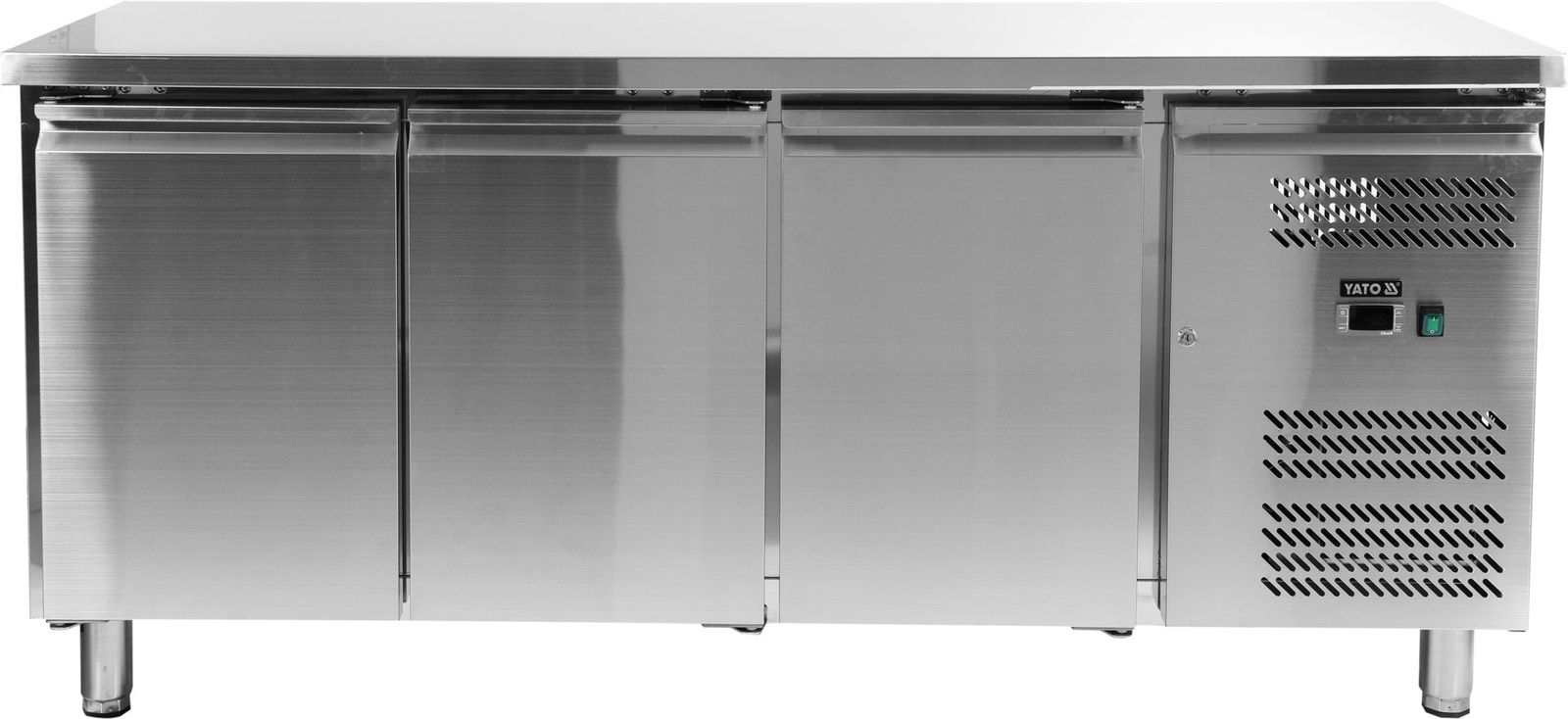 Masa de răcire cu 3 uși marca YATO - linia 600, cu dimensiuni de 179,5x60cm și înălțime reglabilă între 84,5-91,5cm. Capacitate 339l. Carcasa și blatul de lucru sunt fabricate din oțel inoxidabil ss201. Uși cu închidere automată. Echipat cu 3 rafturi grilaj (câte unul pentru fiecare ușă), acoperite cu PVC, cu o capacitate maximă de 40 kg - la încărcare uniformă, cu dimensiuni de 33x42,5 cm. Înălțimea rafturilor este reglabilă pe 11 trepte. Dispozitivul este ușor de întreținut curat, datorită faptului că este montat pe picioare, ceea ce permite curățarea ușoară și sub aparat.