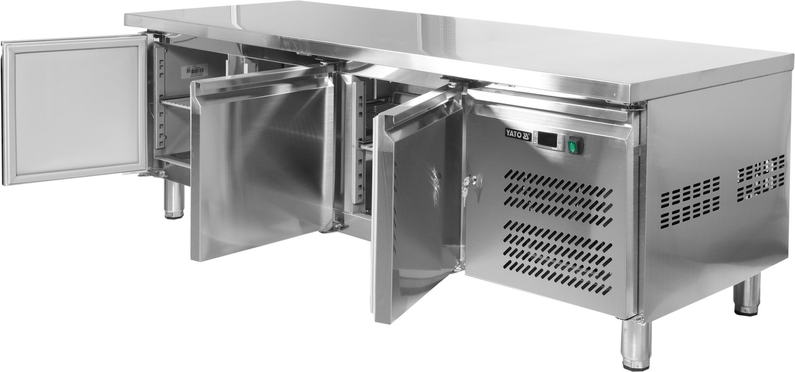 Masa frigorifică cu 3 uși, cu o capacitate de 317 l, marca YATO. Masa are dimensiunile blatului de 179,5x70cm, cu înălțime reglabilă între 65-72cm. Proiectată pentru depozitarea alimentelor la temperaturi cuprinse între -2°C și +8°C. Carcasa exterioară și interioară este realizată din oțel inoxidabil de înaltă calitate 201, ceea ce garantează un aspect elegant și este foarte ușor de curățat. Masa este echipată cu 4 picioare cu înălțime reglabilă între 14-20 cm.