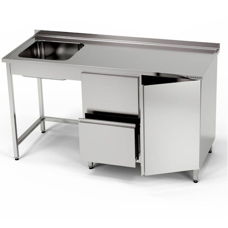 O masă din oțel inoxidabil cu o chiuvetă cu un vas, un dulap și un bloc de sertare este o piesă de mobilier pentru catering profesional, ideală pentru bucătăriile restaurantelor, bucătăriile hotelurilor, cantinele și oriunde altundeva unde igiena și ergonomia sunt importante. Cele mai mari puncte forte ale sale sunt construcția robustă din oțel inoxidabil, funcționalitatea sa derivată din prezența unei chiuvete, a unui dulap și a unor sertare, precum și capacitatea de a personaliza partea laterală a chiuvetei pentru a se potrivi nevoilor individuale ale utilizatorului.