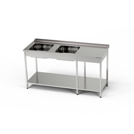Masă cu chiuvetă 2 compartimente și raft, din oțel inoxidabil J4, dimensiuni 220x70x85 cm. Compartimentele pentru chiuvete pot fi amplasate pe partea stângă (L) sau dreaptă (P).