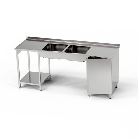 Masă cu chiuvetă 2 compartimente, dulap și raft 270x60x85 cm din oțel inoxidabil J4. Compartimente pentru chiuvetă situate între dulap și raft. Dulap lat de 40 cm plasat pe partea opusă a raftului. Dulapul poate fi poziționat pe partea dreaptă (P) sau stângă (L). Dulapul include un raft.
