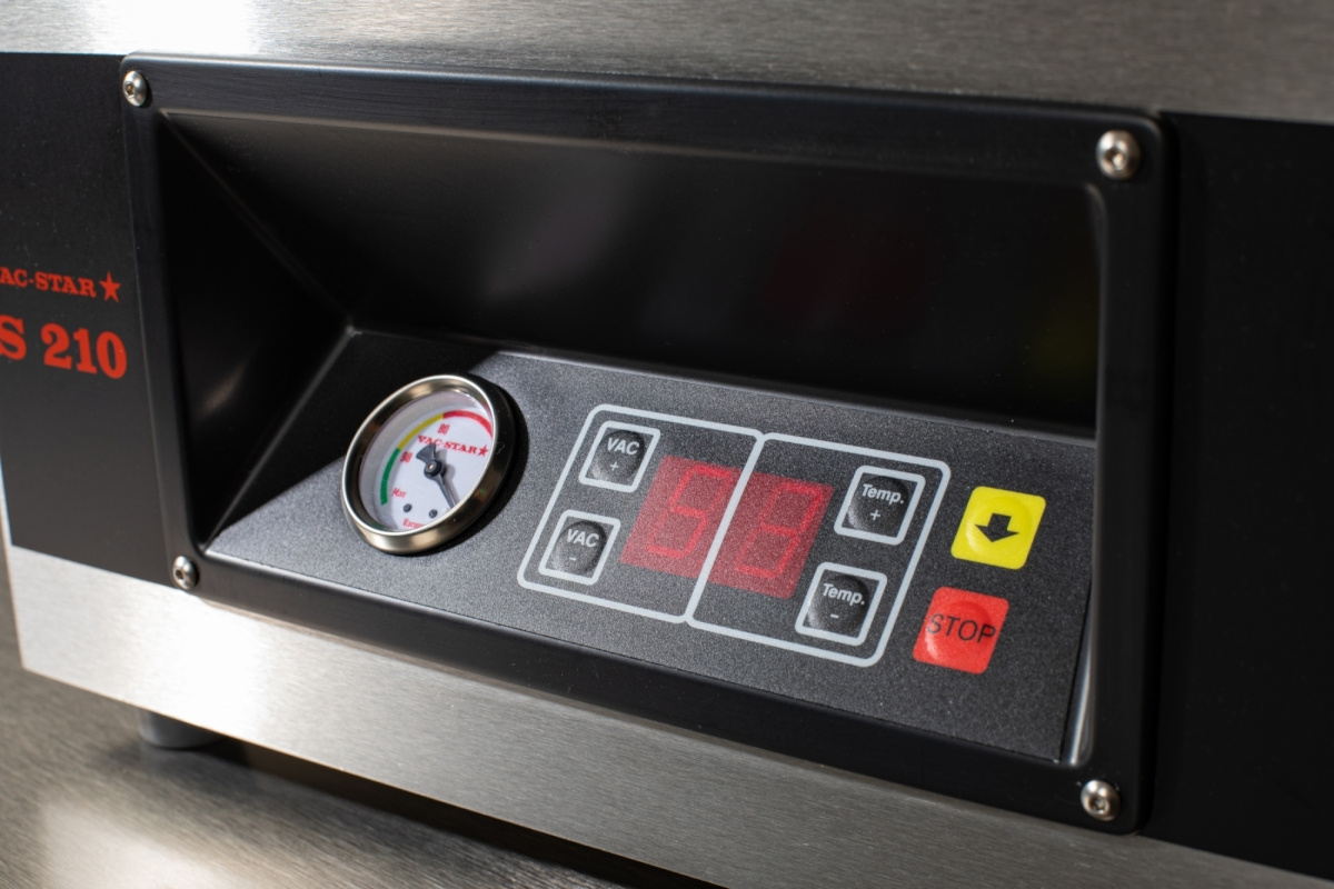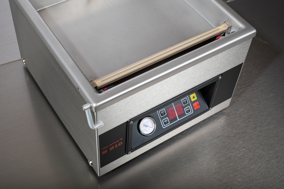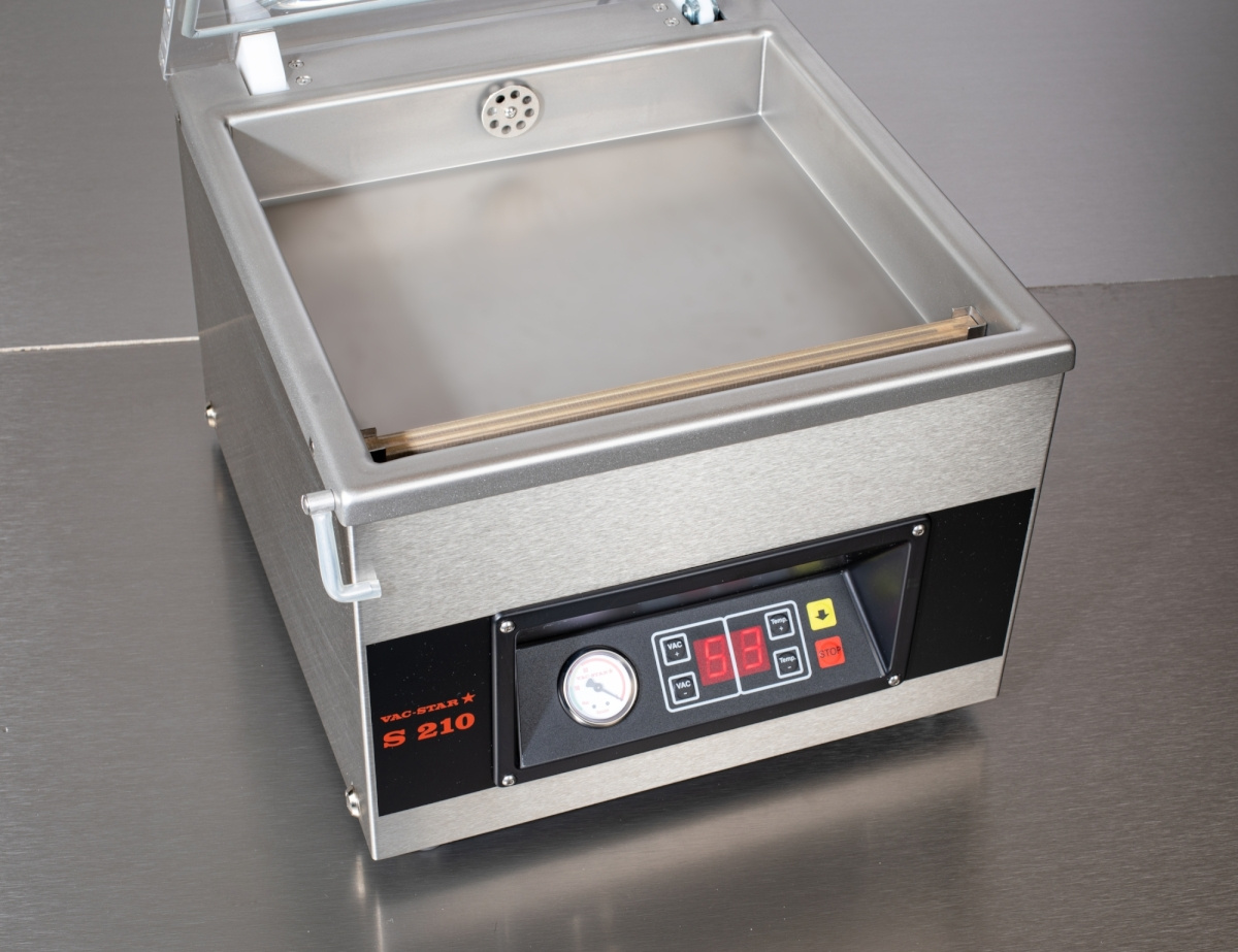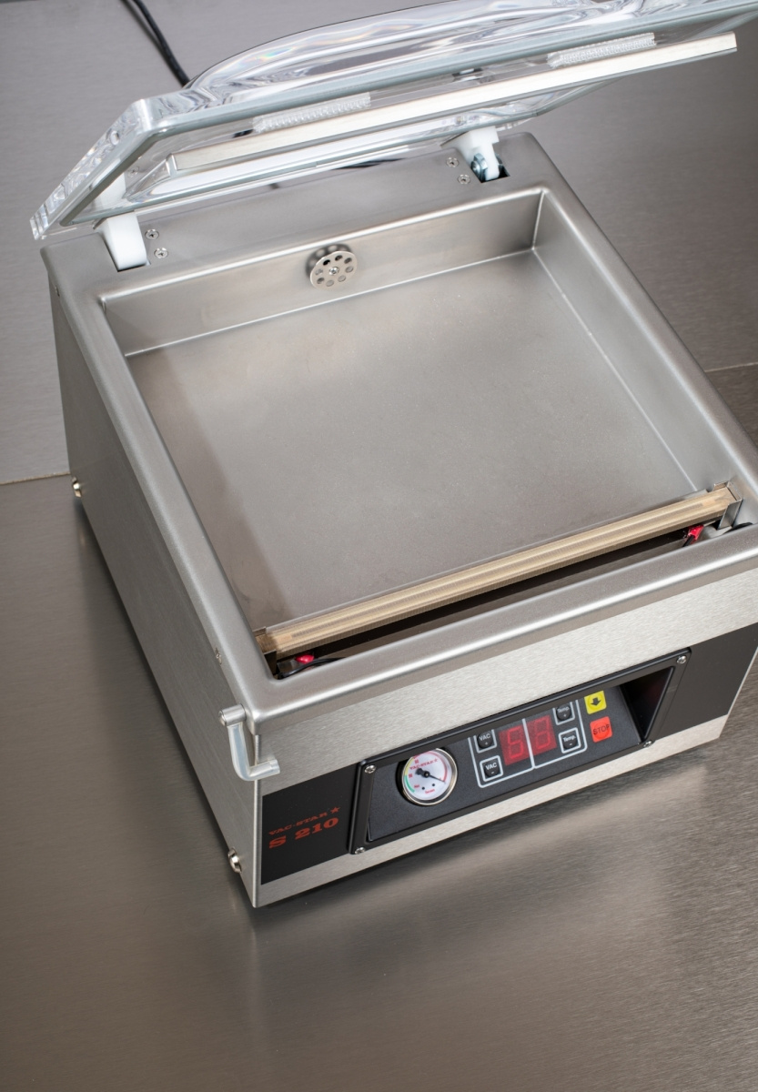 Modelul S-210 DBV a fost proiectat pentru a fi ușor de utilizat și eficient. Are un capac transparent din PMMA (sticlă Plexi), care permite vizualizarea completă a procesului de ambalare. Dimensiunile camerei sunt 335x320x110 mm, ceea ce permite ambalarea produselor în pungi cu dimensiunea maximă de 310x320 mm. Sistemul de control DBV, bazat pe cronometru, permite setarea precisă a timpului de vidare și sigilare. Datorită manometrului, nivelul de vid poate fi monitorizat ușor, iar procesul de ambalare începe automat după închiderea capacului.