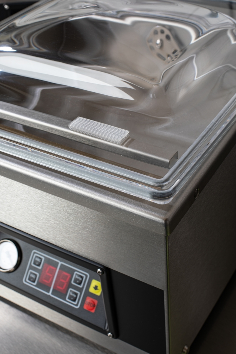 Masina de ambalat este realizată integral din oțel inoxidabil (Inox), ceea ce îi conferă durabilitate, rezistență la coroziune și ușurință în curățare. Funcția STOP și posibilitatea de sigilare manuală oferă control total asupra procesului de ambalare, iar sigilarea dublă de 2x3 mm garantează închiderea sigură a pungilor. Capacul acrilic de înaltă calitate și funcția de aspirare a lichidelor fac ca aparatul să îndeplinească toate cerințele unei bucătării moderne.