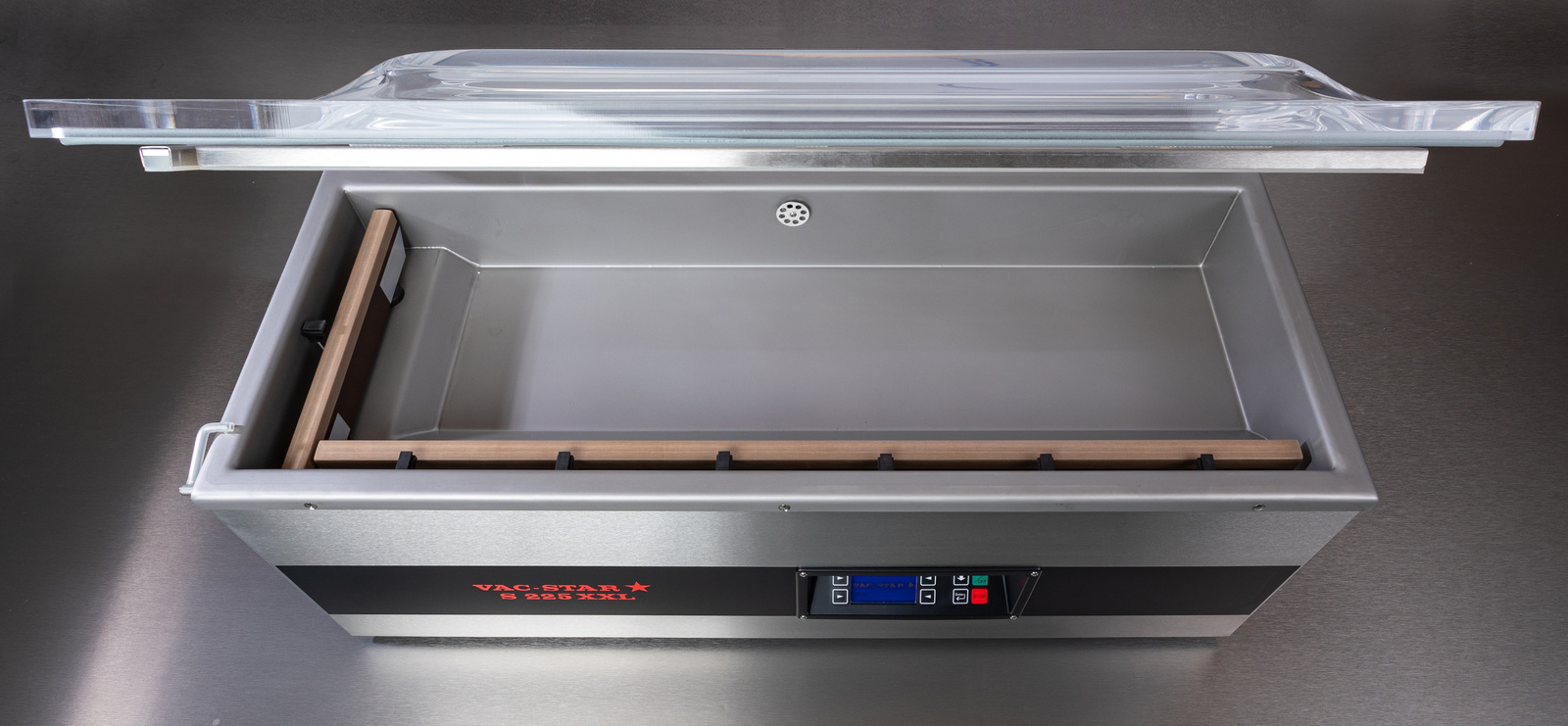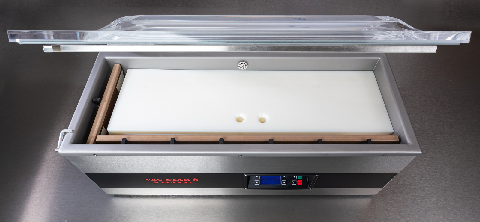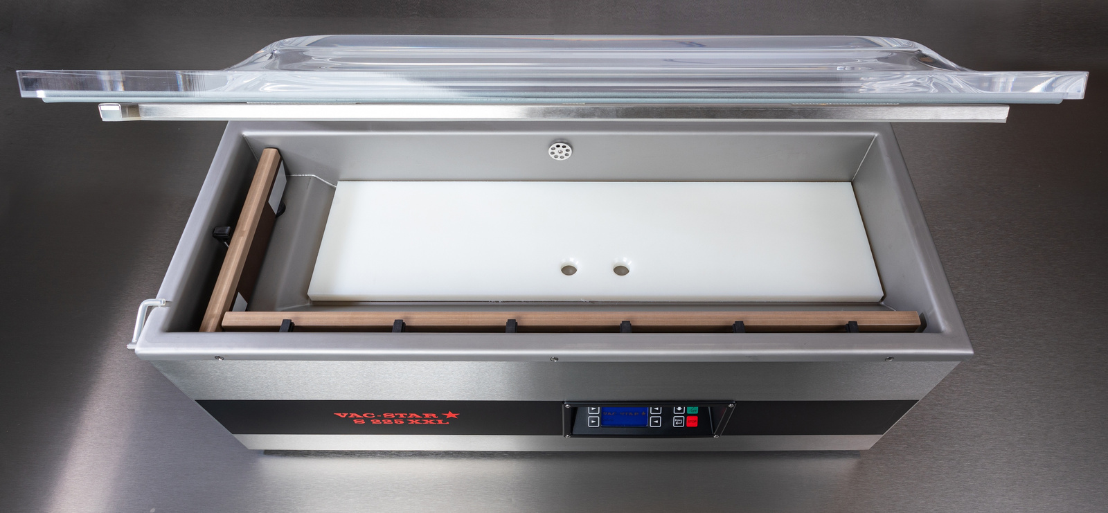 Modelul S 225-XXL PX dispune de o cameră spațioasă cu dimensiunile de 950×330×160 mm, permițând ambalarea produselor în pungi cu dimensiunea maximă de 280×950 mm. Capacul transparent din PMMA (sticlă Plexi), echipat cu arcuri pe gaz, asigură vizibilitate completă a procesului de ambalare, facilitând controlul și gestionarea. Echipamentul standard include trei inserții realizate din polietilenă albă și o inserție pentru lichide, permițând ambalarea comodă a produselor umede și lichide.