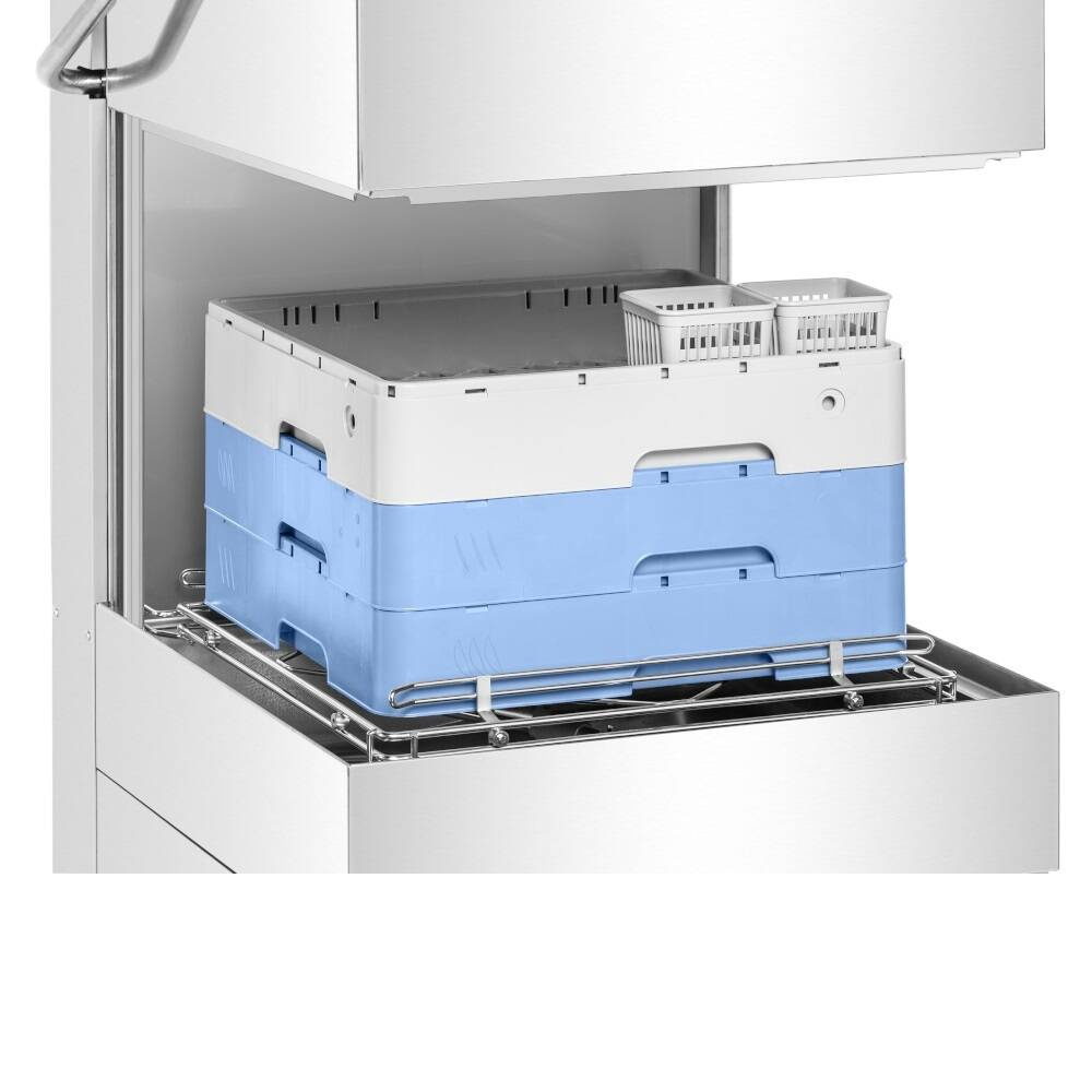 - Eficiență ridicată și cicluri rapide de spălare – Mașina permite spălarea a până la 40 de coșuri pe oră, cu cicluri de 90 sau 120 de secunde. Astfel, este ideală pentru locațiile cu un volum mare de vase de spălat, cum ar fi bucătăriile hotelurilor sau școlilor.