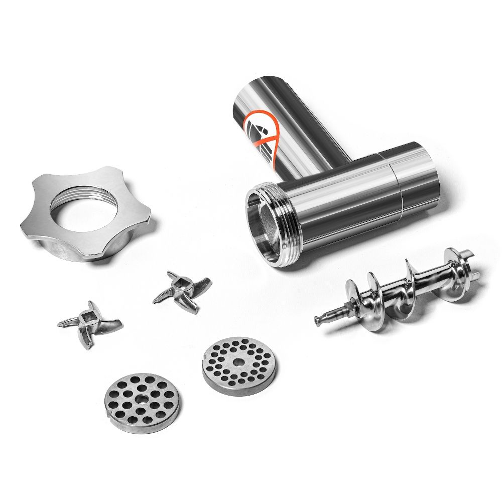 Dispozitivul este realizat în întregime din oțel inoxidabil de înaltă calitate, ceea ce garantează nu doar rezistența la deteriorări mecanice, ci și ușurința întreținerii curățeniei și îndeplinirea cerințelor sanitare. Setul include două site cu diametrul găurilor de 6 mm și 8 mm, ceea ce permite ajustarea gradului de măcinare la nevoile utilizatorului – de exemplu, pentru pregătirea umpluturii pentru chiftele sau pentru producerea cârnaților. Diametrul exterior al sitei este de 59,5 mm, iar grosimea de 9 mm, ceea ce asigură stabilitate și durabilitate în timpul funcționării.