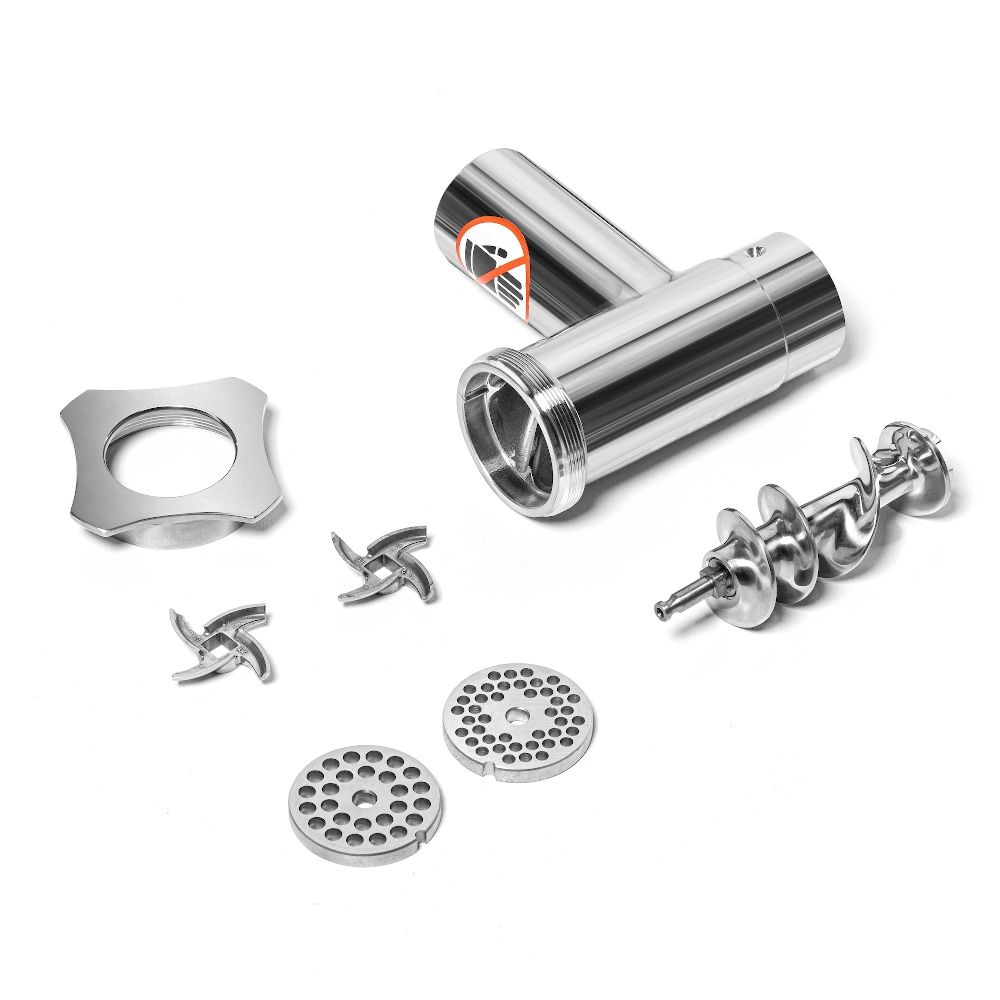 Mașina FORGAST FG10103 este echipată cu un accesoriu pentru tocat care poate fi demontat ușor, simplificând considerabil procesul de spălare și întreținere. Setul include două site cu diametrul orificiilor de 6 mm și 8 mm, ceea ce permite obținerea gradului dorit de mărunțire a cărnii, în funcție de preparatul realizat. Fiecare sită are un diametru exterior de 70 mm, garantând compatibilitatea cu dispozitivul și confortul la utilizare. În set se găsește și un mâner ergonomic, care facilitează transportul și poziționarea mașinii pe blatul de bucătărie, aspect deosebit de important în bucătăriile profesionale, unde mobilitatea și flexibilitatea sunt esențiale.