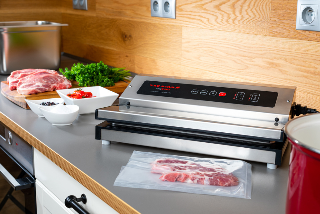 Masina de ambalat easyPRO permite ambalarea ușoară chiar și a porțiilor mai mari – fără probleme se poate introduce un kilogram de carne sau un pește mai mic întreg. Datorită utilizării pungilor de vid cu structură specială, se păstrează prospețimea, culoarea naturală și aroma produselor. Un accesoriu ideal pentru aparat sunt capetele sous-vide, care îmbogățesc suplimentar gustul mâncărurilor.