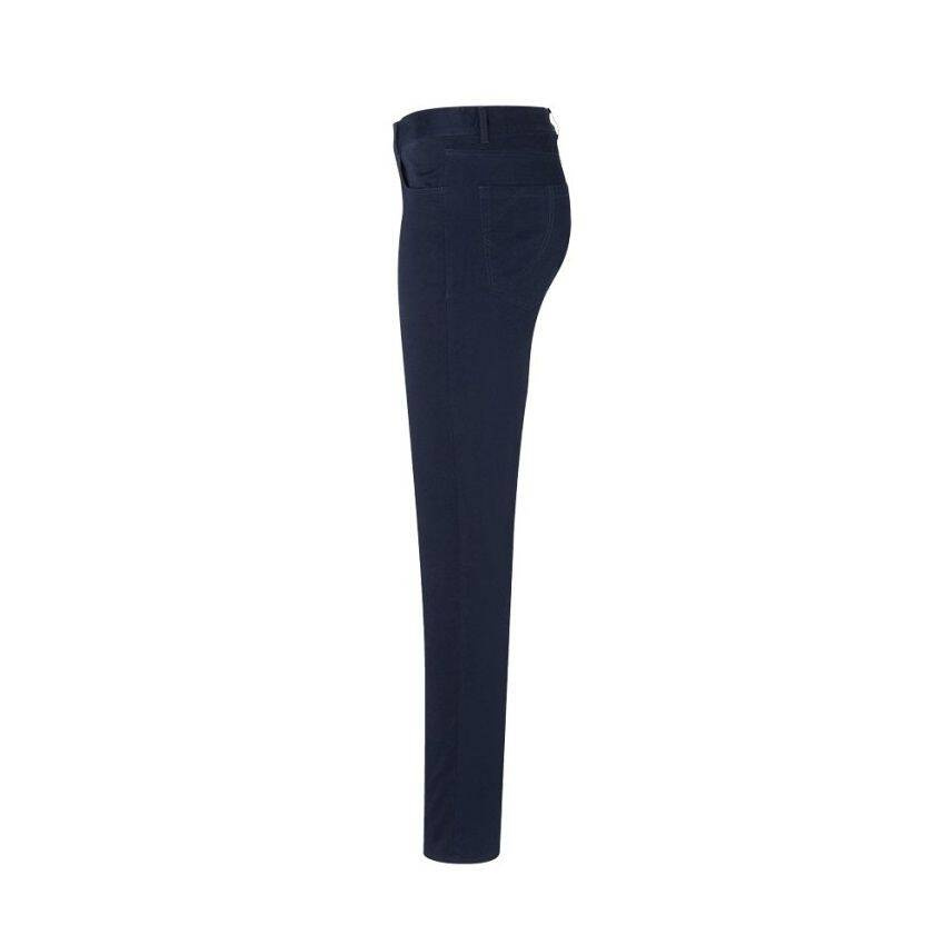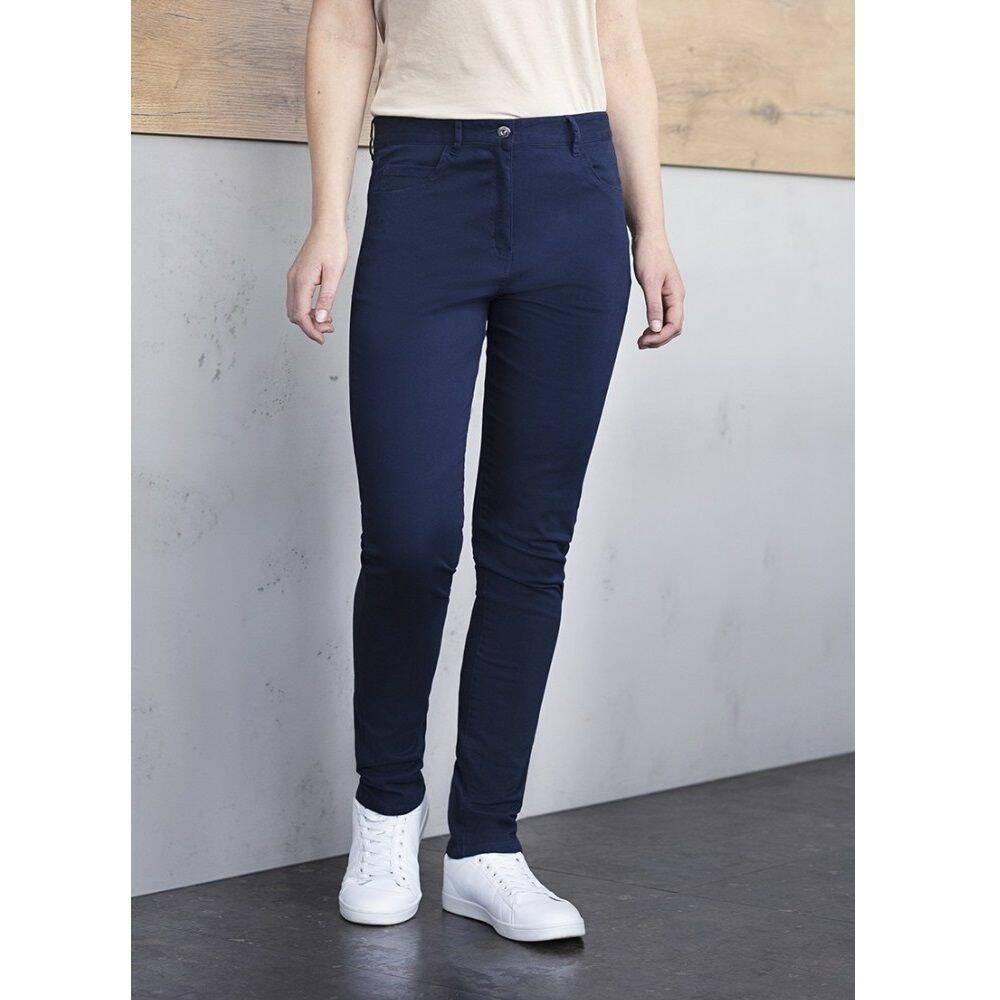 Pantaloni damă cu 5 buzunare de la brandul Karlowsky. Culoare albastră. Realizați din 98% bumbac organic cu adaos de 2% elastan. Țesătură diagonală. Durabili și elastici. Pantaloni ideali atât pentru muncă, cât și pentru purtarea de zi cu zi. Se vor potrivi cu succes în domenii precum bucătărie, service, îngrijire, wellness, cosmetică, curățenie și medicină. Croială ajustată, cracii se îngustează către gleznă. În față se află 2 buzunare standard și un buzunar mic pentru monede pe partea dreaptă. La spate, 2 buzunare. Pantalonii sunt prevăzuți cu bride pentru curea.