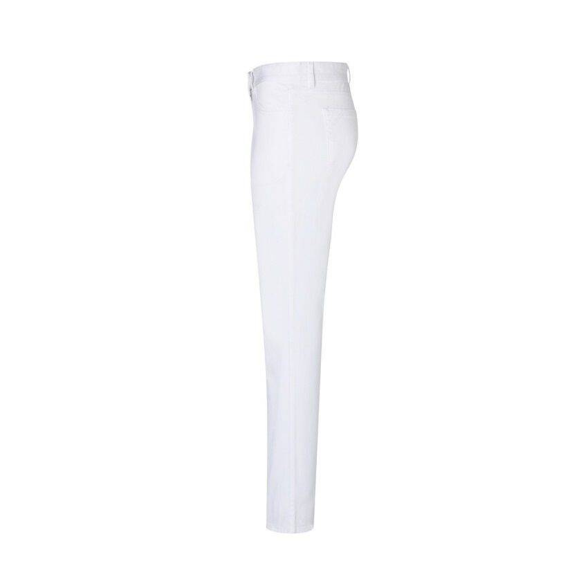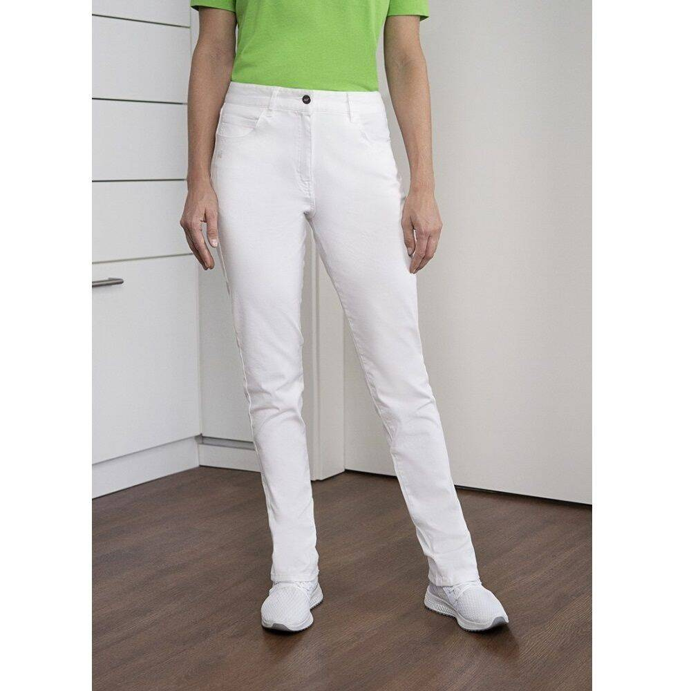 Pantaloni damă cu 5 buzunare de la marca Karlowsky. Culoare albă. Realizați din 98% bumbac organic cu adaos de 2% elastan. Țesătură diagonală. Durabili și elastici. Pantaloni ideali atât pentru muncă, cât și pentru purtare zilnică. Sunt potriviți în domenii precum bucătărie, servicii, îngrijire, wellness, cosmetică, curățenie și medicină. Croială ajustată, cu cracii îngustați spre gleznă. În față se află 2 buzunare standard și un buzunar mic pentru monede pe partea dreaptă. La spate, 2 buzunare. Pantalonii sunt prevăzuți cu bride pentru curea.