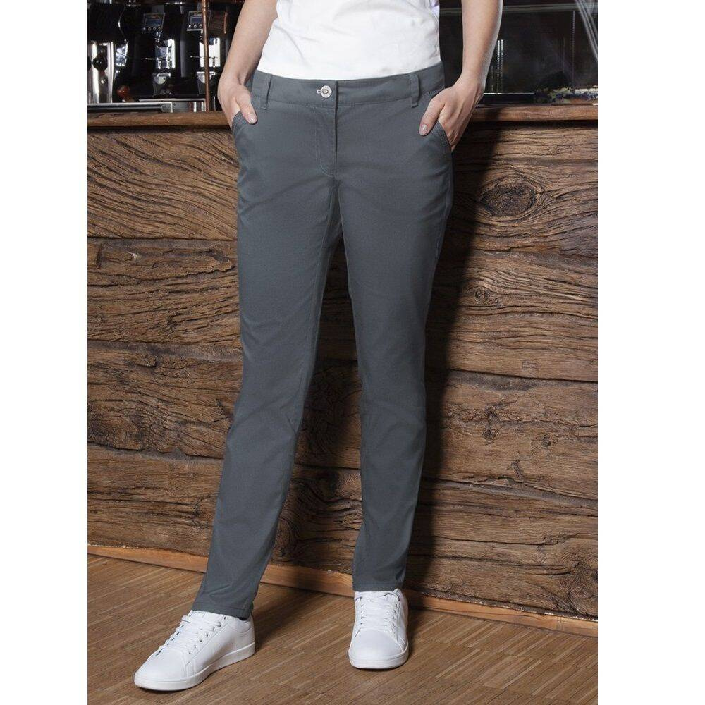 Pantaloni de damă cu 5 buzunare marca Karlowsky. Culoare antracit. Confecționați din 98% bumbac organic cu adaos de 2% elastan. Țesătură diagonală. Durabili și elastici. Pantalonii sunt ideali atât pentru muncă, cât și pentru utilizarea zilnică. Se potrivesc perfect în domenii precum bucătărie, servicii, îngrijire, wellness, cosmetică, curățenie și medicină. Croială ajustată, cu cracii înguștiți în partea de jos. În față se află 2 buzunare standard și un buzunar mic pentru monede pe partea dreaptă. La spate, 2 buzunare. Pantalonii sunt prevăzuți cu bride pentru curea.
