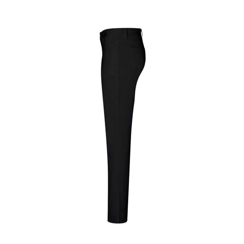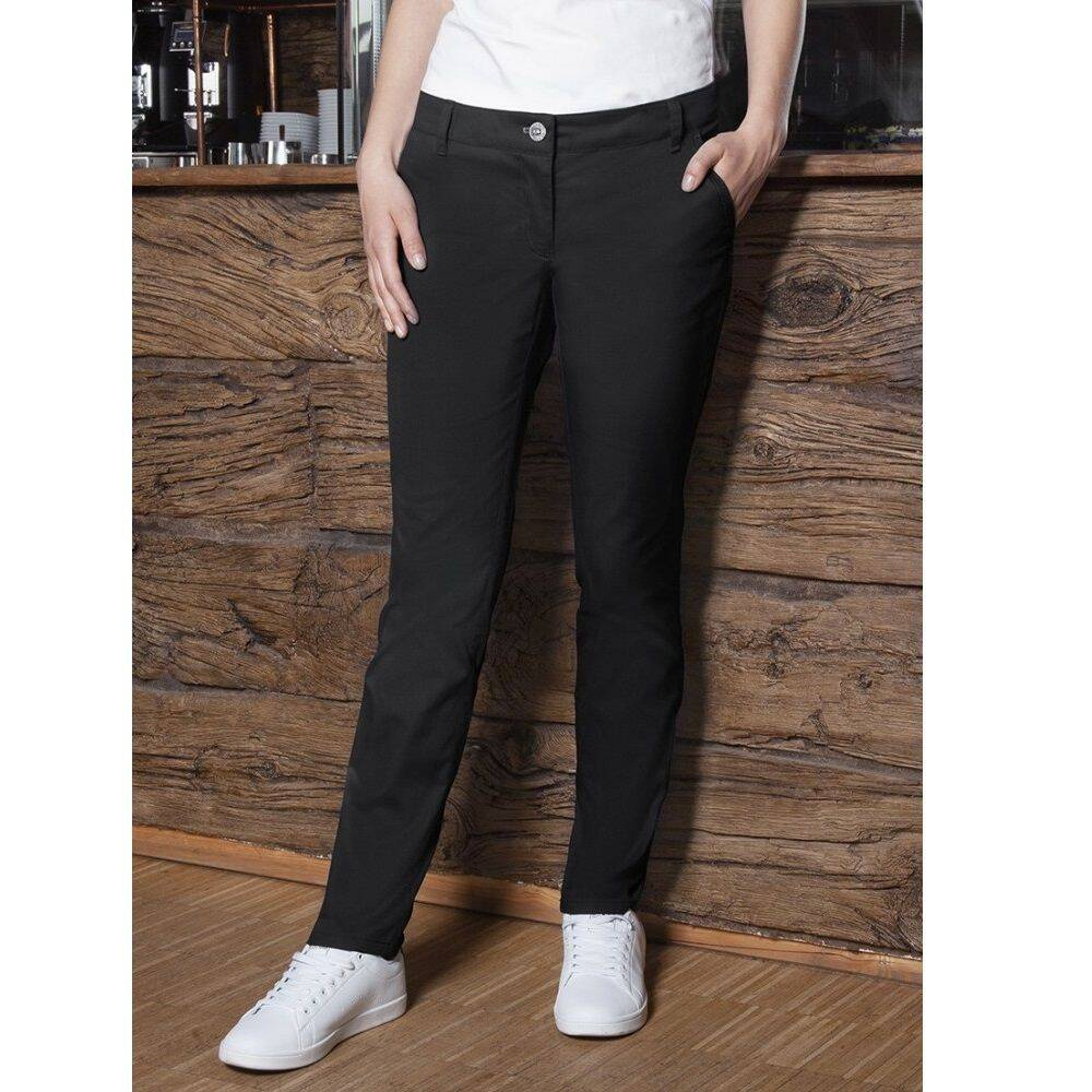 Pantaloni damă cu 5 buzunare de la marca Karlowsky. Culoare neagră. Realizați din 98% bumbac organic cu adaos de 2% elastan. Țesătură diagonală. Durabili și elastici. Pantalonii sunt ideali atât pentru muncă, cât și pentru purtarea zilnică. Se potrivesc perfect în domenii precum bucătărie, servicii, îngrijire, wellness, cosmetică, curățenie și medicină. Croială ajustată, cracii pantalonilor înguștiți în partea de jos. În față se află 2 buzunare standard și un buzunar mic pentru monede pe partea dreaptă. La spate, 2 buzunare. Pantalonii sunt dotați cu bride pentru curea.