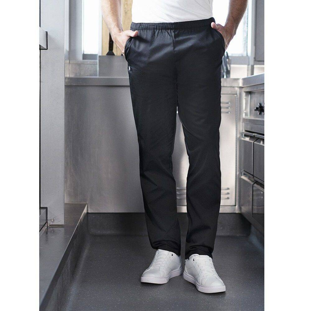 Pantaloni slip-on Essential de la Karlowsky. Culoare neagră. Realizați din 65% poliester și 35% bumbac. Țesătură diagonală. Pantaloni de lucru unisex confortabili și rezistenți, cu talie elastică și șnur pentru ajustarea mărimii, care facilitează îmbrăcarea. Pantaloni cu crac drept. Pantalonii au 2 buzunare laterale și 1 aplicat la spate. Țesătura ușoară asigură confort plăcut la purtare în activitatea zilnică. Foarte rezistenți la spălare la 95°C, culorile la 60°C. Pot fi spălați și călcați. Nu se albesc. Disponibili în mărimi de la XS până la 5XL.