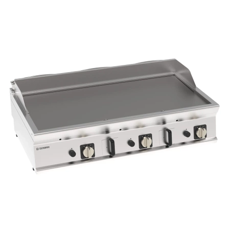 Unitatea este prevăzută cu o placă de oțel netedă, încastrată și sudată ermetic la blatul de lucru, permițând prăjirea diferitelor feluri de mâncare în cantități mari. Blatul de gătit cu grosimea de 15 mm este înclinat pentru a facilita scurgerea grăsimilor și a lichidelor într-un sertar detașabil cu orificiu de scurgere pentru confort și igienă. Trei zone de lucru independente sunt încălzite de trei arzătoare din oțel cromat cu 2 ramuri, fiecare cu o putere de 7 kW, ceea ce permite controlul precis al temperaturii și optimizarea procesului de gătit.