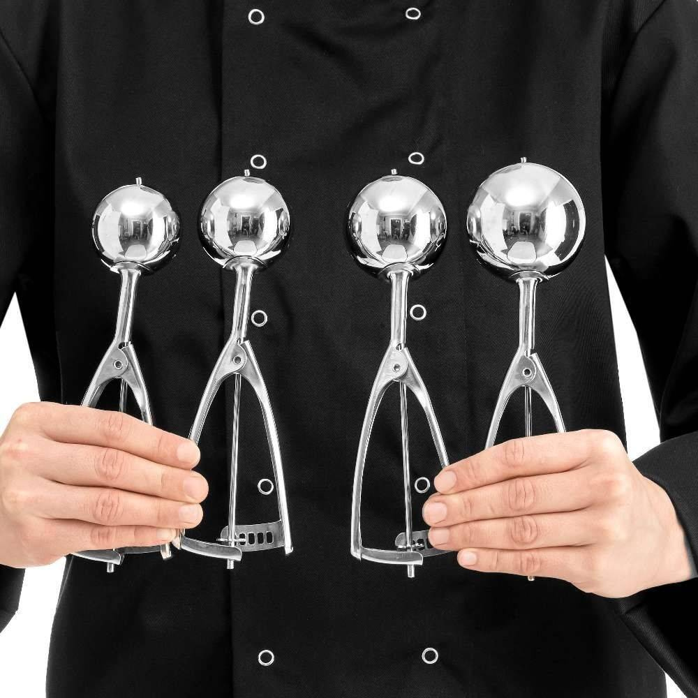 - Versatilitate – porționatorul este perfect pentru formarea bilelor de înghețată ideale, dar la fel de bine se descurcă la servirea piureului de cartofi, orezului sau a altor produse alimentare semilichide și granulate.