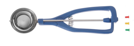 Porționator pentru înghețată, realizat din oțel inoxidabil. Mânerul este fabricat din nailon.